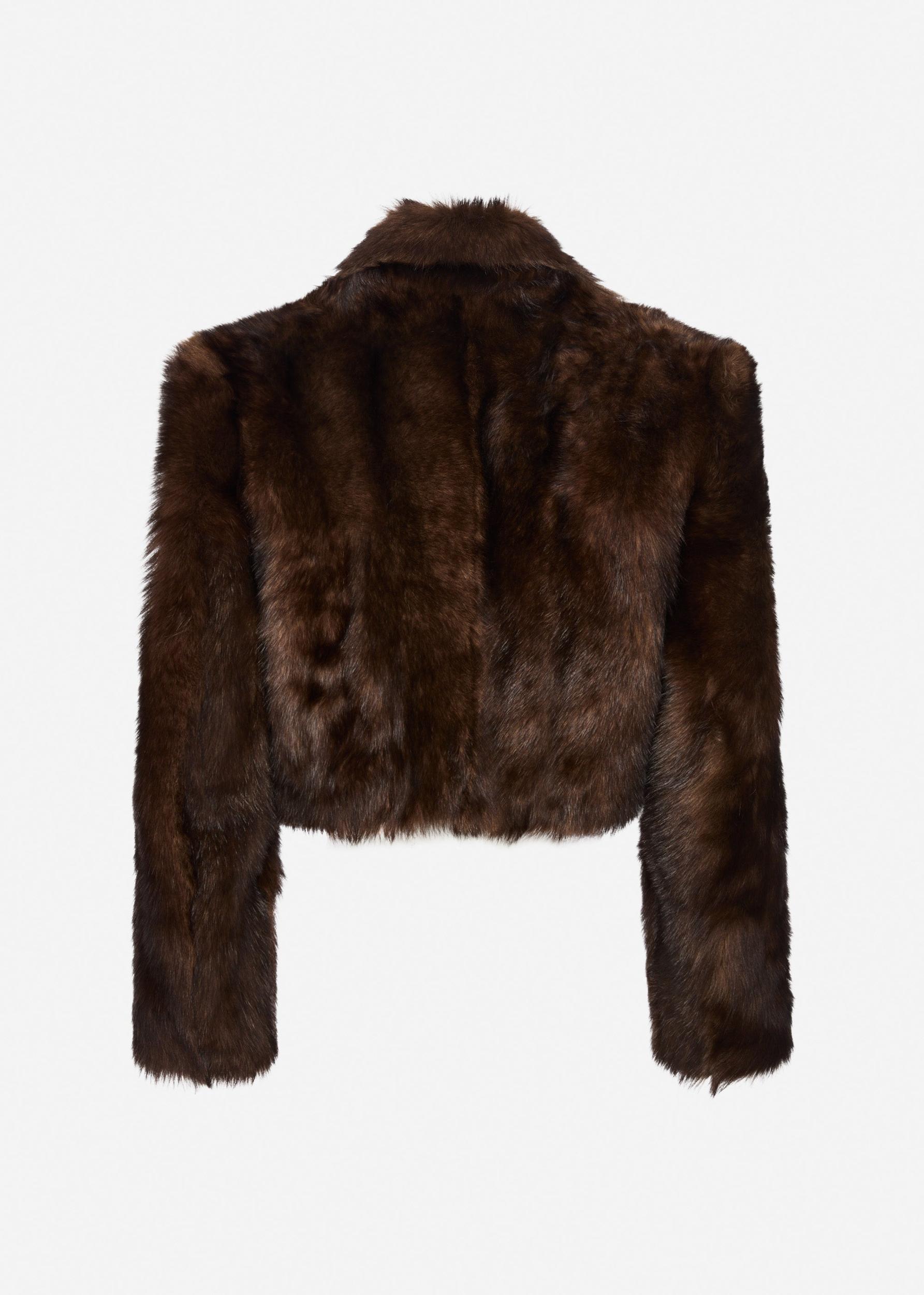 A luxurious cropped jacket crafted from soft, high-pile faux fur in rich chocolate brown. Designed with a classic collar and front hook fastening. The interior features a signature embroidered lining, adding an elegant Magda Butrym finishing touch.