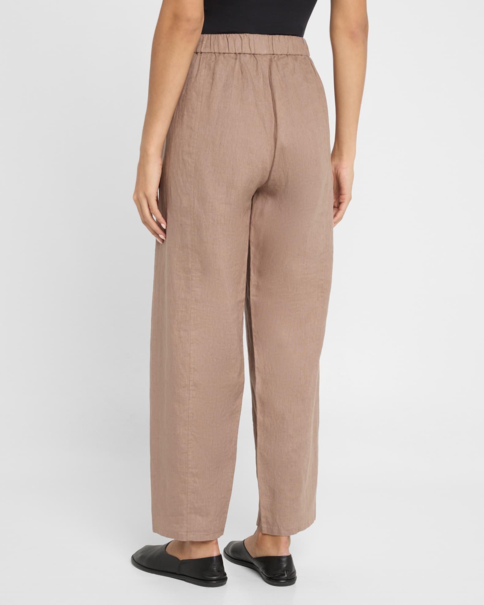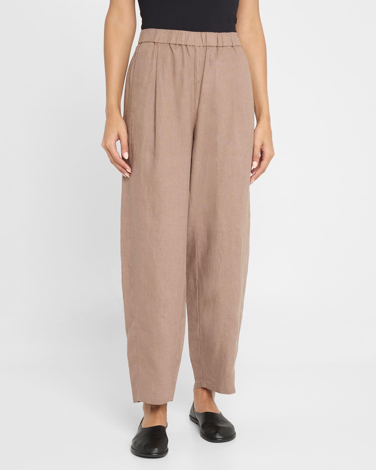 Eileen Fisher pants crafted in medium-weight organic linen Approx. 28" inseam Mid-rise sits high on the hips Elasticized waistband Pleated front On-seam pockets Cropped at the ankle Wide, tapered legs Pull-on style Organic linen Machine wash cold Imported