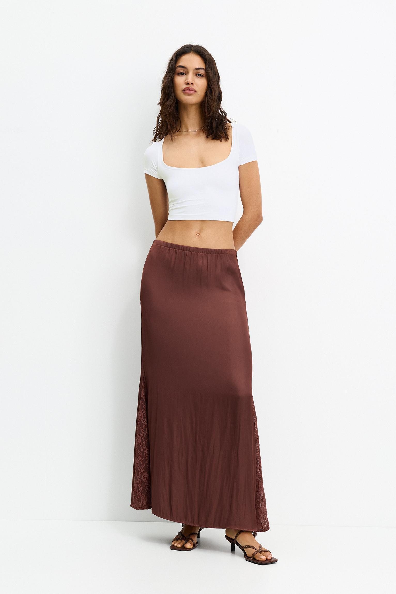 Polyamide cropped T-shirt with a wide neckline and short sleeves.
