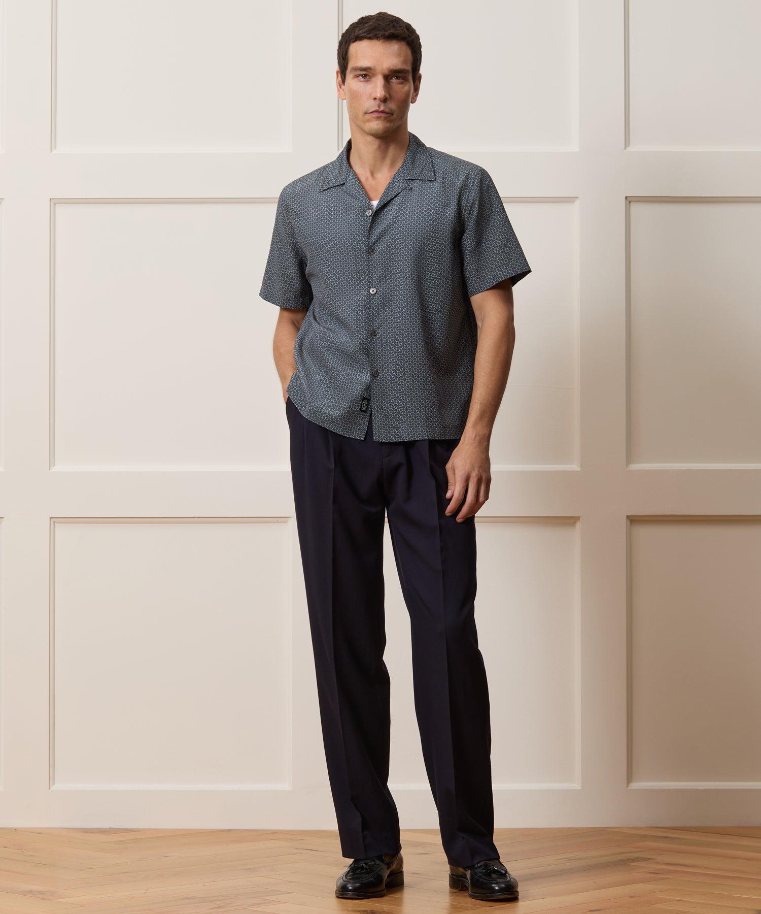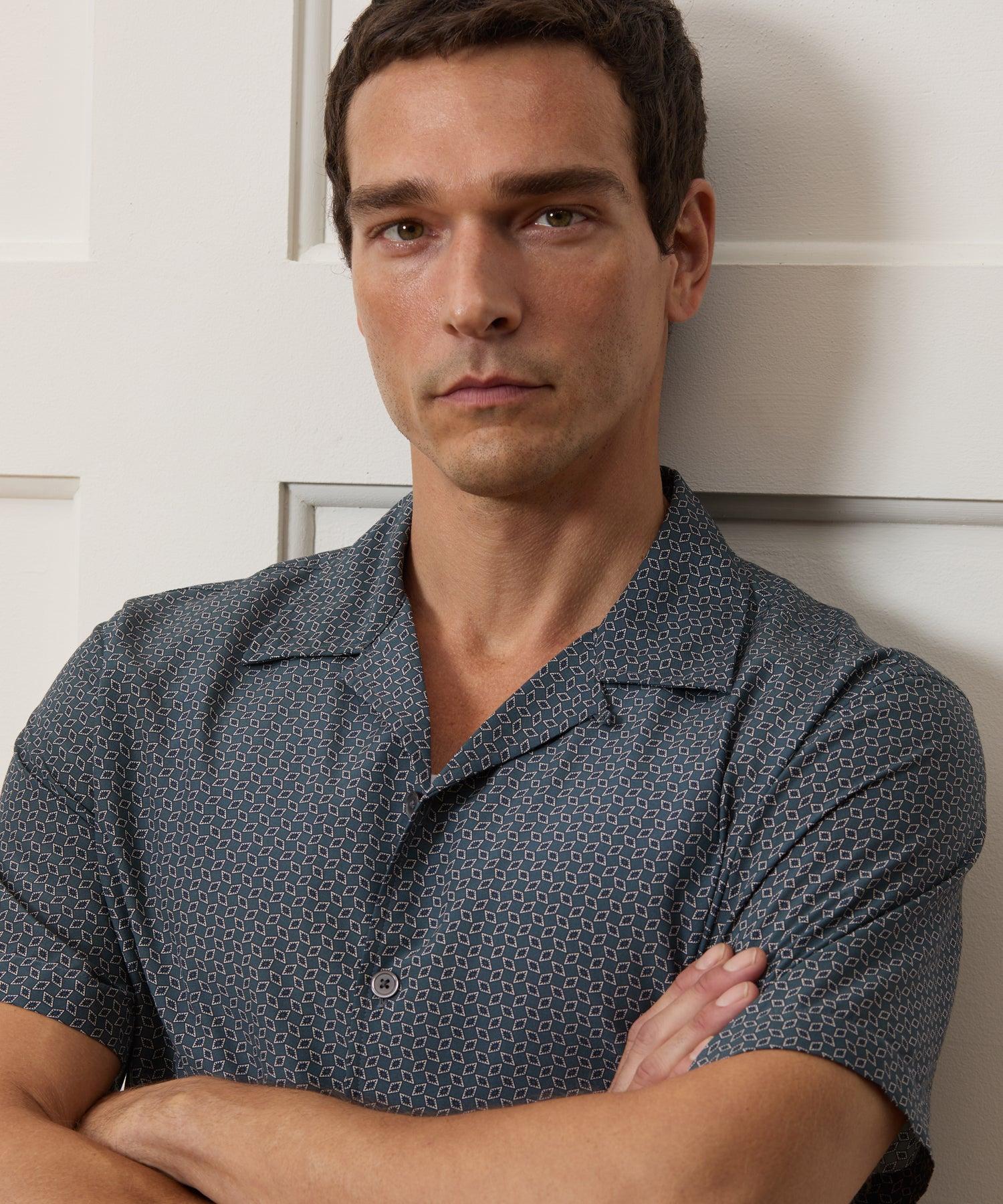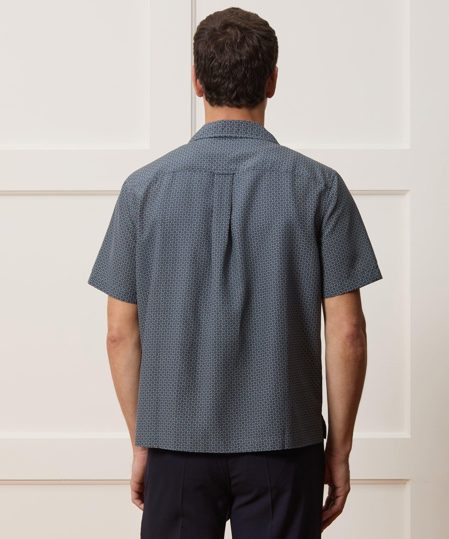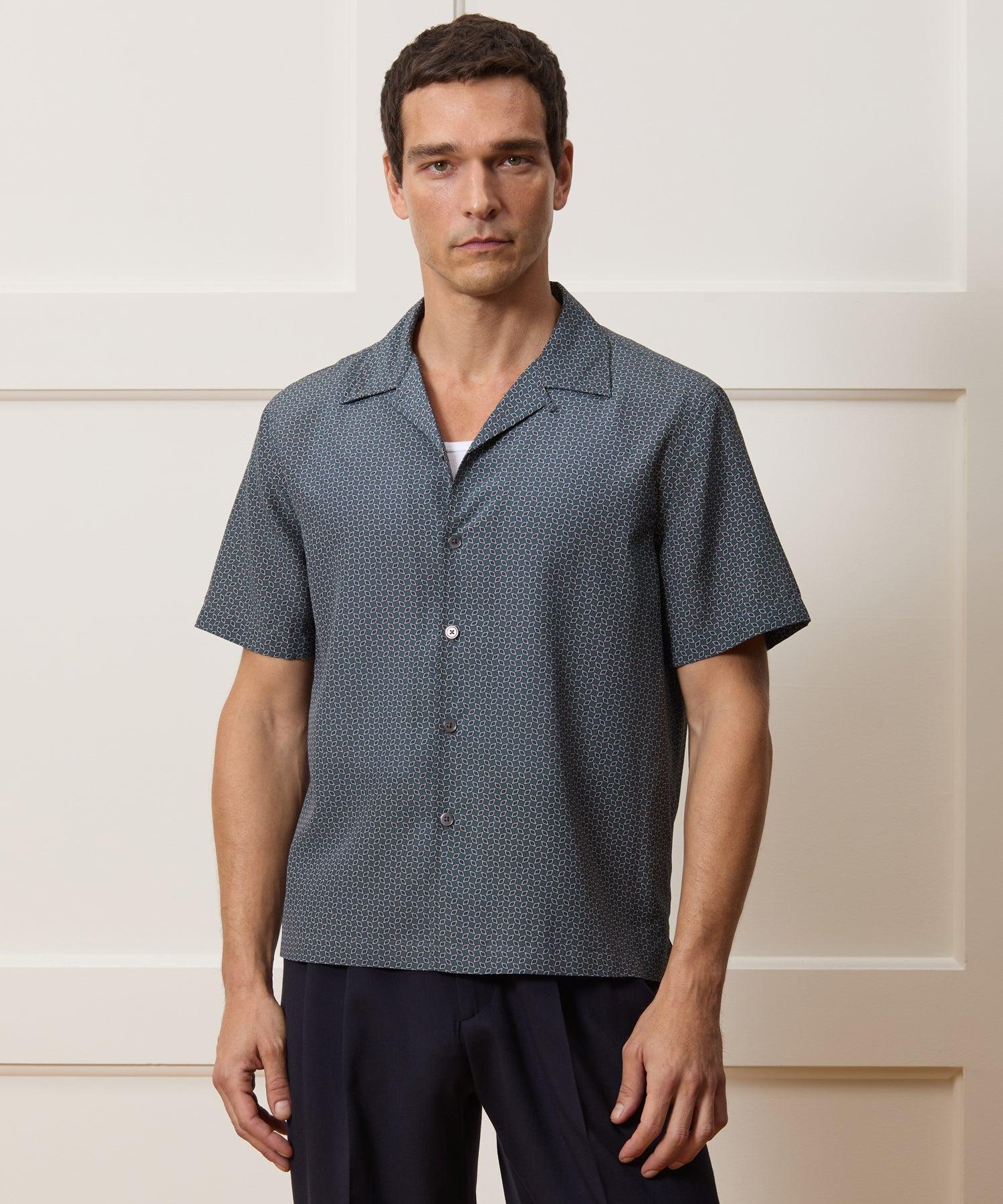 Our comfortable Camp Collar Shirts are a year-round favorite for effortlessly cool vibes. This one is made from a lightweight silk and cotton blend, with a small geometric print inspired by 80s foulard ties. Cut with an on-trend, boxy fit, it's just the thing for days when you want something easy to pop on that still makes an impact. 67% Silk, 33% Cotton Boxy, Cropped Fit Model is 6'2" and is wearing a size Medium Camp Collar Button Cuffs Split Side Seams at Hem Fabric from China Garment Made in Vietnam Hand Wash Cold Separately. Only Non-Chlorine Bleach When Needed. Lay Flat To Dry. Cool Iron As Needed. Dry Clean. Style SH8310457