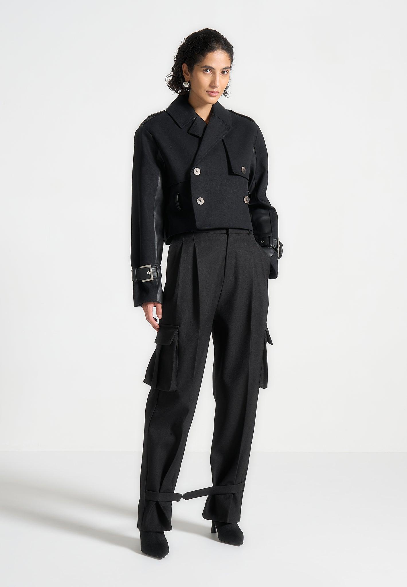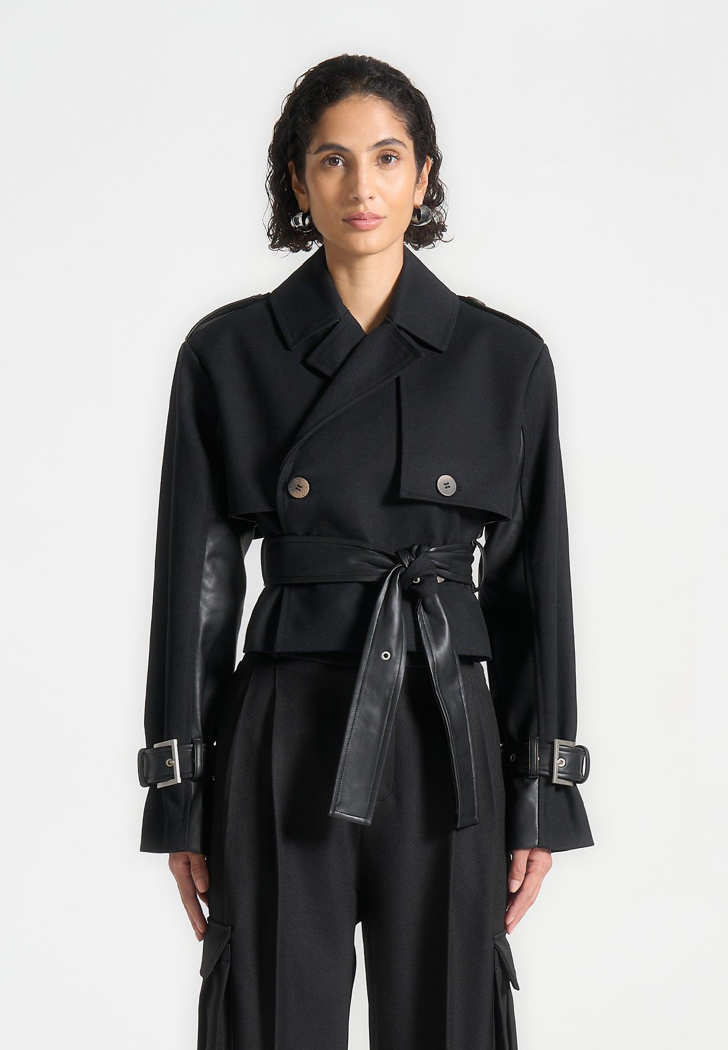 Discover the perfect blend of style and practicality. Featuring a unique contrast fabric design, this coat is both eye-catching and versatile. The belted waist adds a flattering touch, while the cropped length adds a modern twist. Elevate your wardrobe with this must-have piece. Cropped Jacket Silhouette Lapel Collar Shoulder Epaulets Vegan Leather Contrasting Fabric Detachable Self Tie Belt Vegan Leather Manière De Voir Debossed Eiffel Patch