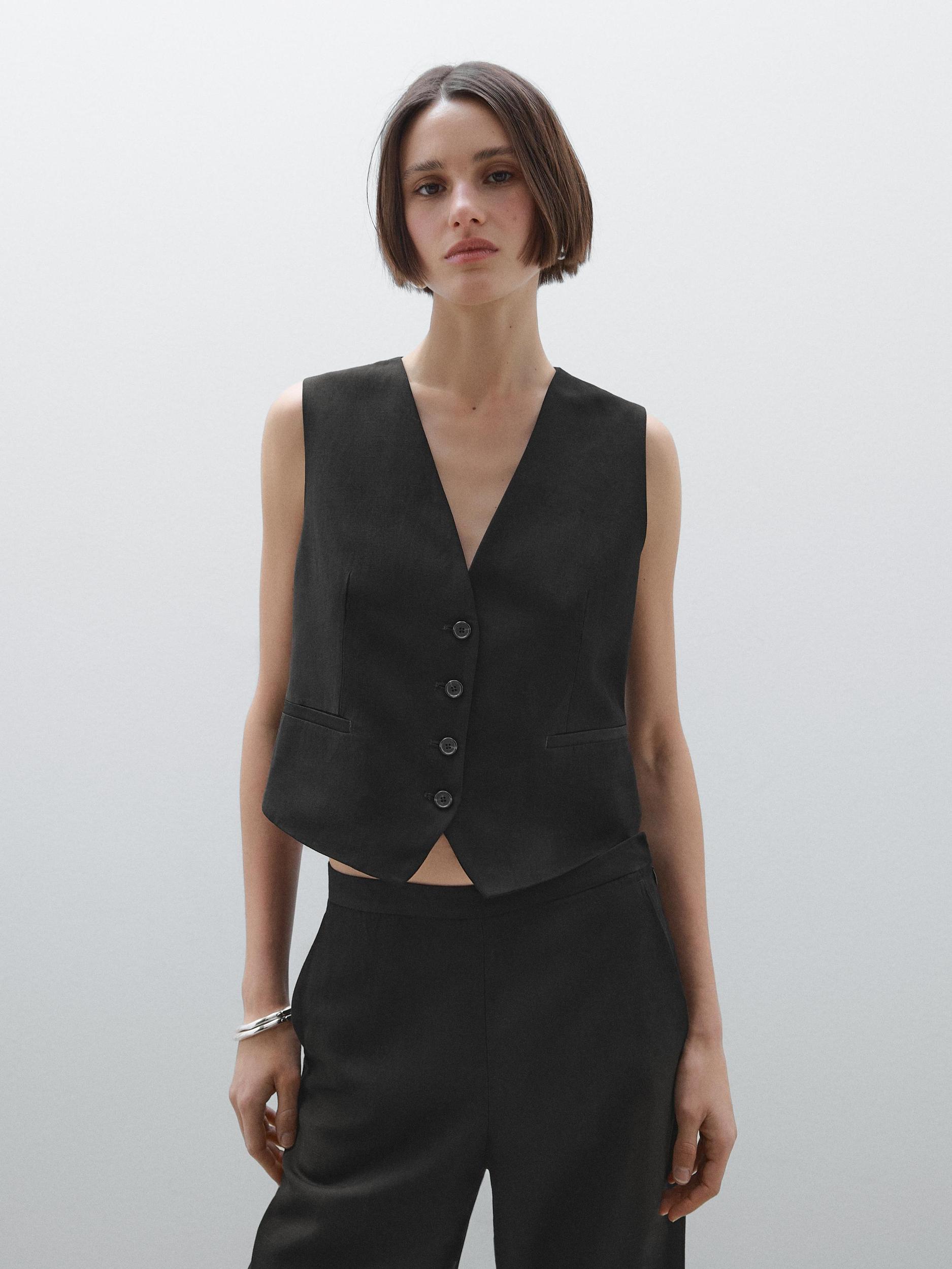 Waistcoat made of a linen blend fabric, V-neck, Button-up front, Cotton lining, This garment is shorter than usual.