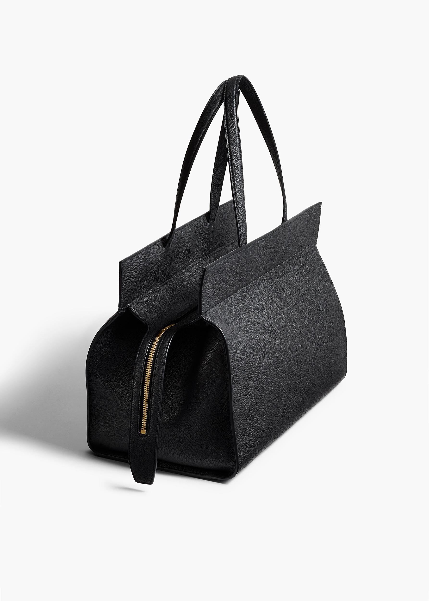 A clean-lined zip-top carryall designed to fit daily essentials with ease. Crafted in Italy of small-grain pebbled calfskin. Twinned straps to carry on the shoulder or by hand. Spacious interior illuminated by bonded lining of velvety suede. Includes zippered pouch that doubles as a clutch.