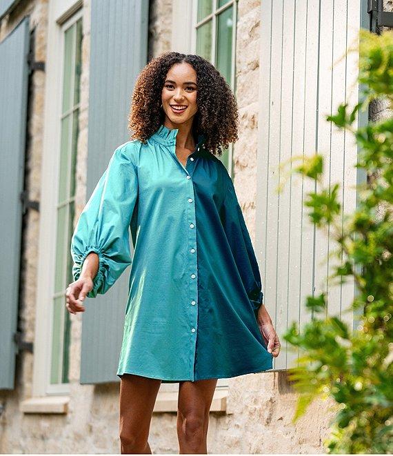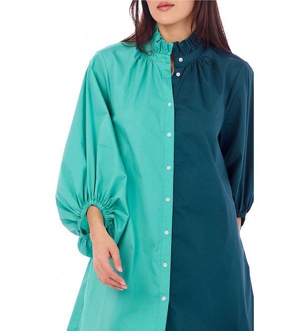 From CROSBY by Mollie Burch, this dress features: Colorblock pattern Ruffle collar neckline Long balloon sleeve Elastic sleeve opening detail Button down closure Side seam slit pockets Approx. 35.5" Cotton/Nylon/Spandex Machine washable/line dry Imported