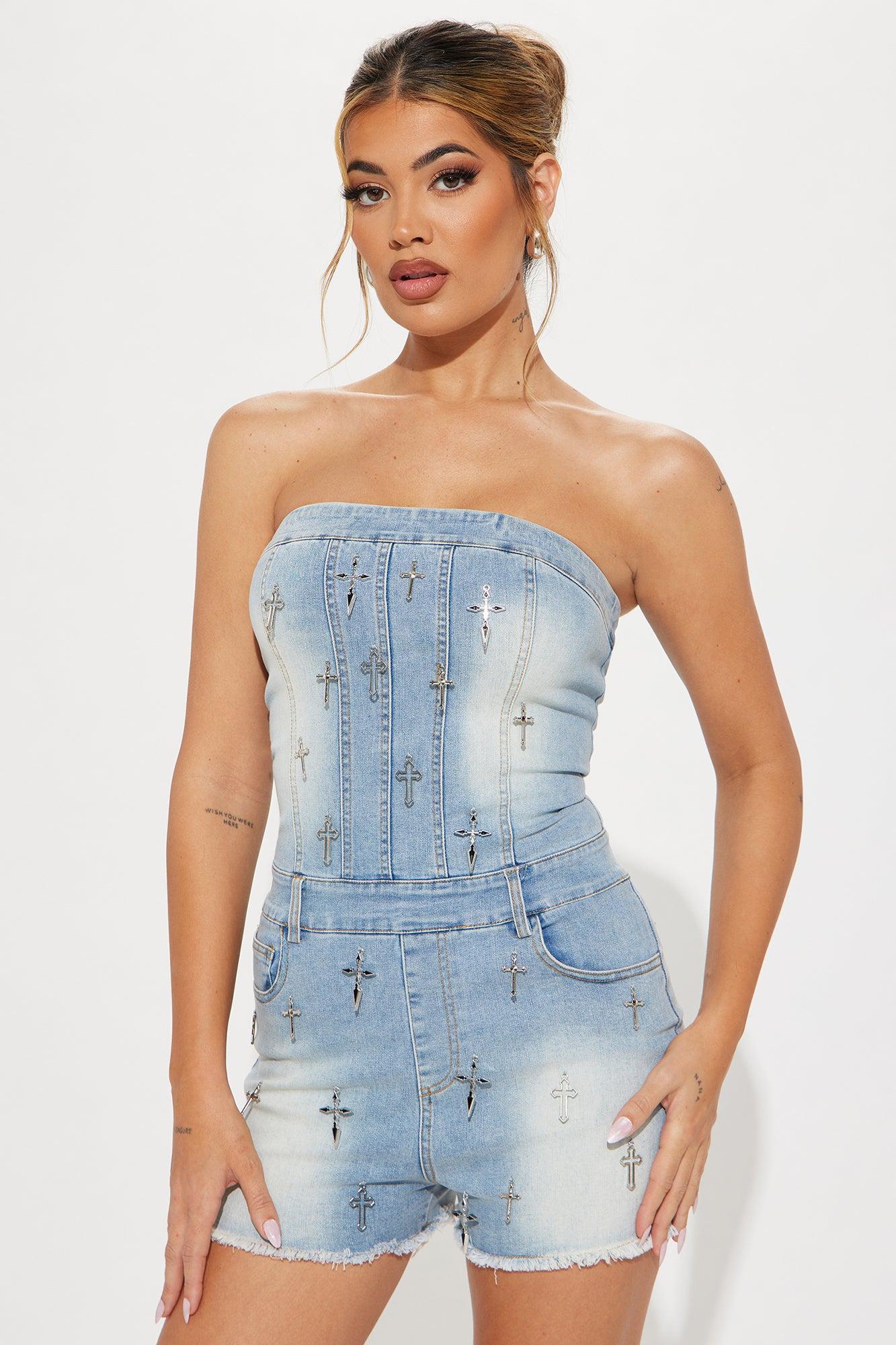 Available In Light Wash. Denim Romper Strapless Straight Neckline Cross Embellished Back Zipper Short Stretch Disclaimer: Due To The Specialized Wash. Each Garment Is Unique. Disclaimer: Due To The Distressing Process, Each Garment Is Unique Self: 70% Cotton 24% Polyester 4% Rayon 2% Spandex Imported California Proposition 65 WARNING: Cancer and Reproductive Harm - www.P65Warnings.ca.gov.