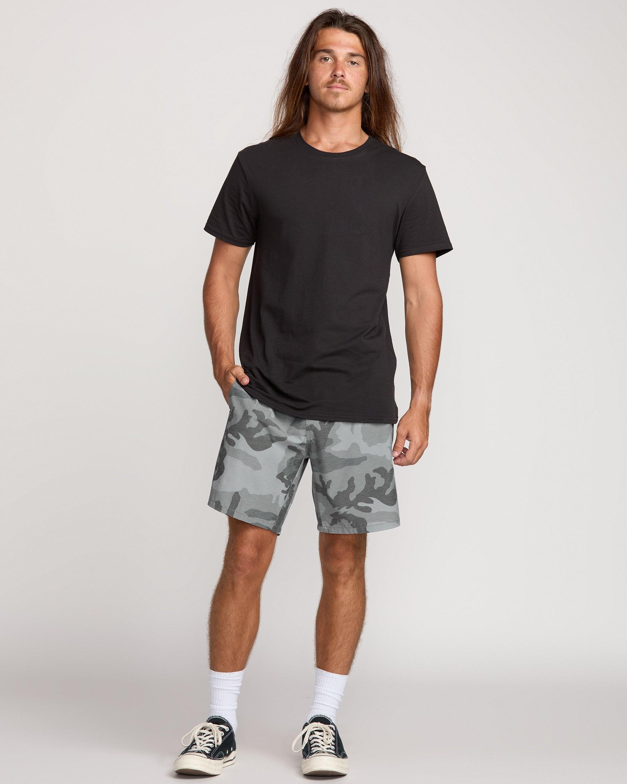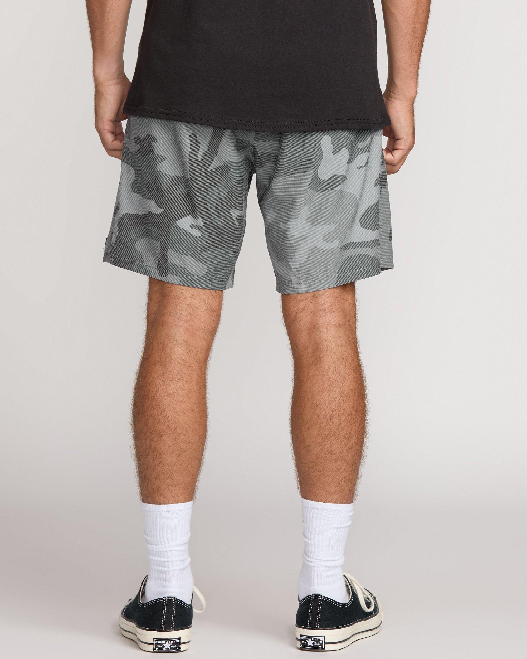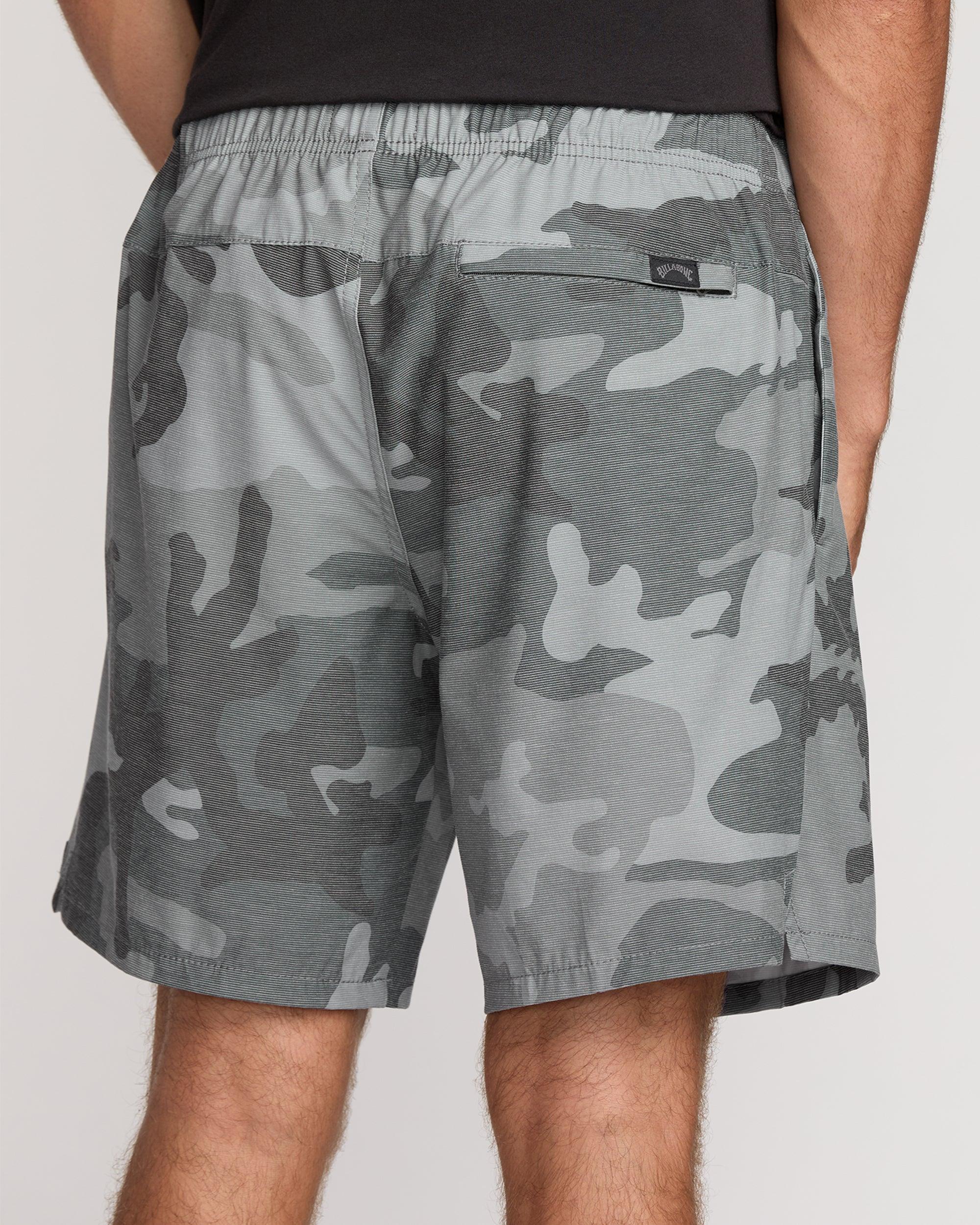 Our Billabong quick dry hybrid shorts rock a 4way stretch quad blend fabric with slub stripe oxford detailing. Side pockets, plus a secure zippered compartment let you store essentials on the move. Elastic waist with drawcord delivers custom comfort. Featured here in the Black Camo colorway. Features 4way stretch quad blend, slub, stripe, oxford 18" Elastic waist Elastic waist with drawcord Side entry pockets, back welt pocket with zip closure and hidden media pocket Elastic waist short with exterior drawcord closure, back welt pocket with zip closure and hidden media pocket Billabong wave label at left leg and back pocket woven label Micro repel quick dry.