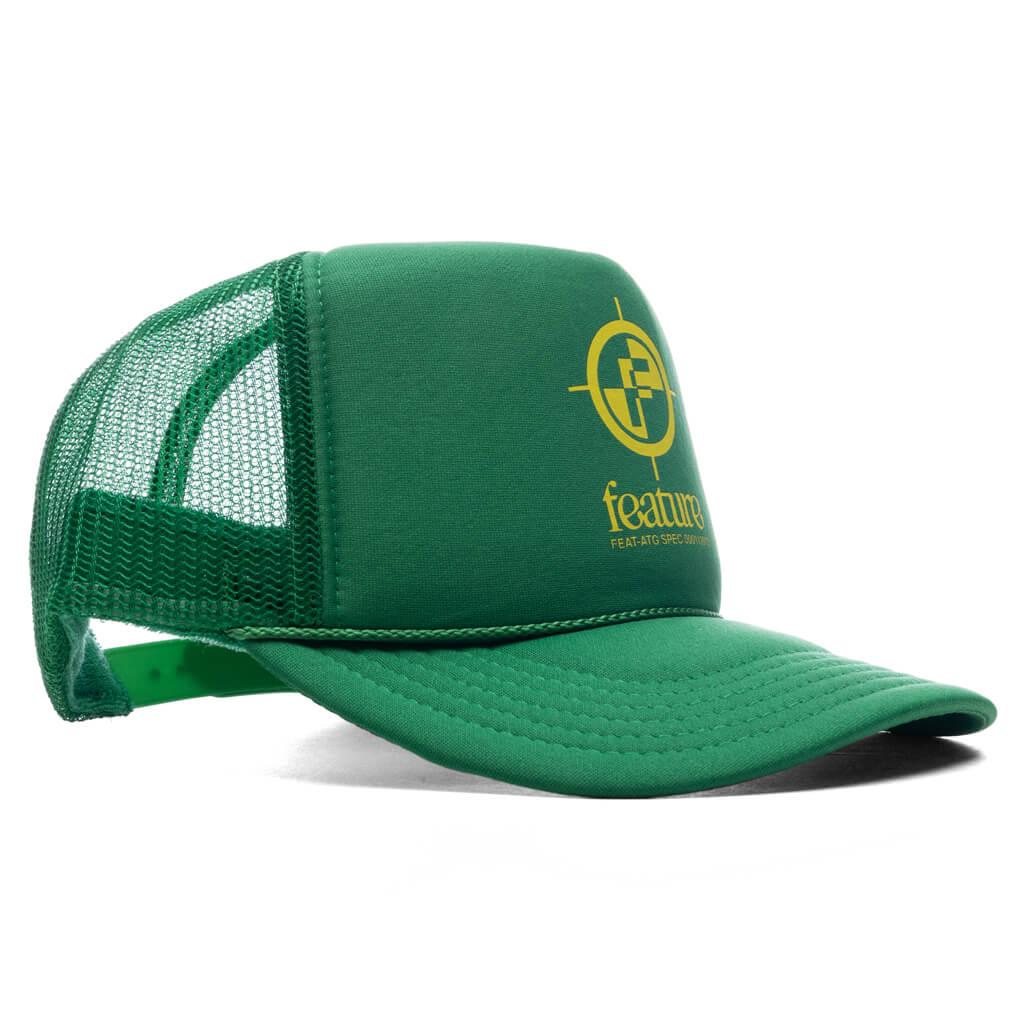 The Crosshair Trucker in Kelly Green combines style and comfort with its structured polyester foam front and netted material for breathability. Featuring screen-printed FEATURE branding, this one-size-fits-all hat is finished with an adjustable strapback closure, offering a customizable fit and timeless trucker look. Polyester foam front One size Structured front Netted material Screen-printed FEATURE branding Adjustable strapback closure Style No: F070724X01-KEL