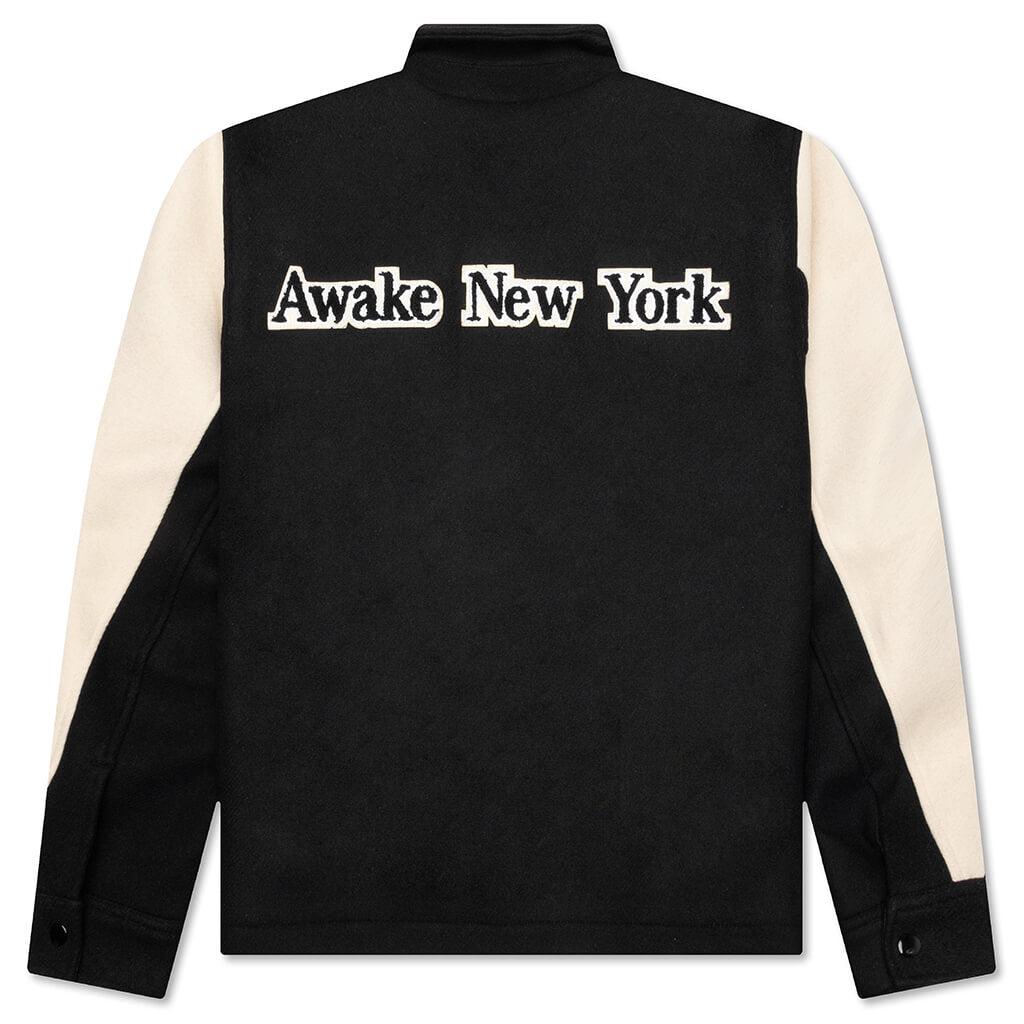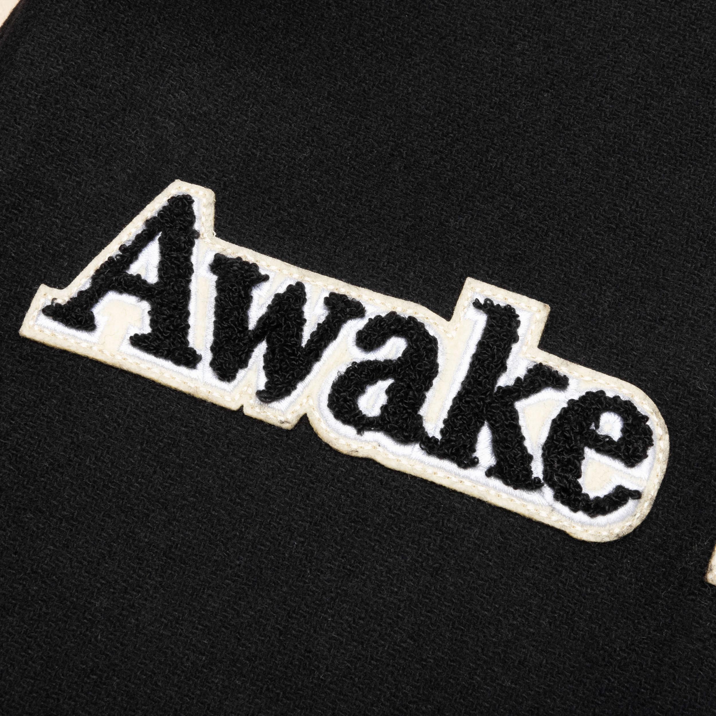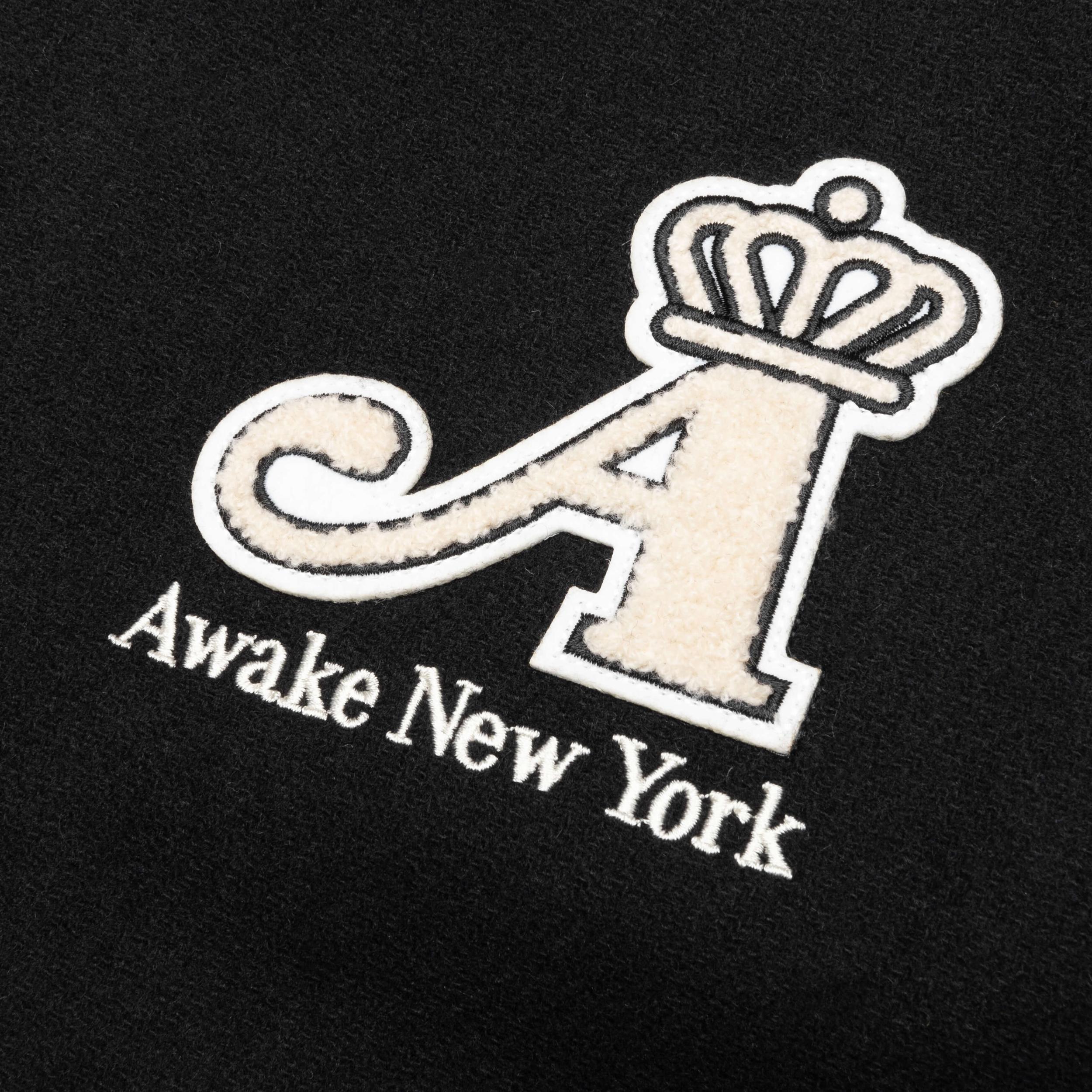 Introducing the Awake Crown Varsity Jacket. This wool varsity jacket boasts a classic snap-front closure, exuding timeless style. Leather welt pockets add a touch of luxury and functionality. The standout feature is the intricate chenille embroideries on both the front and back, showcasing a regal crown emblem. Wool Construction Leather welt pockets Snap-front closure Style No: AWK-FW23-OT005-SAF