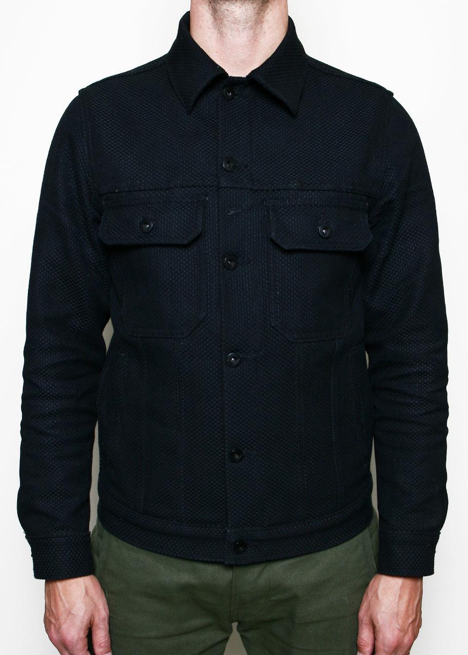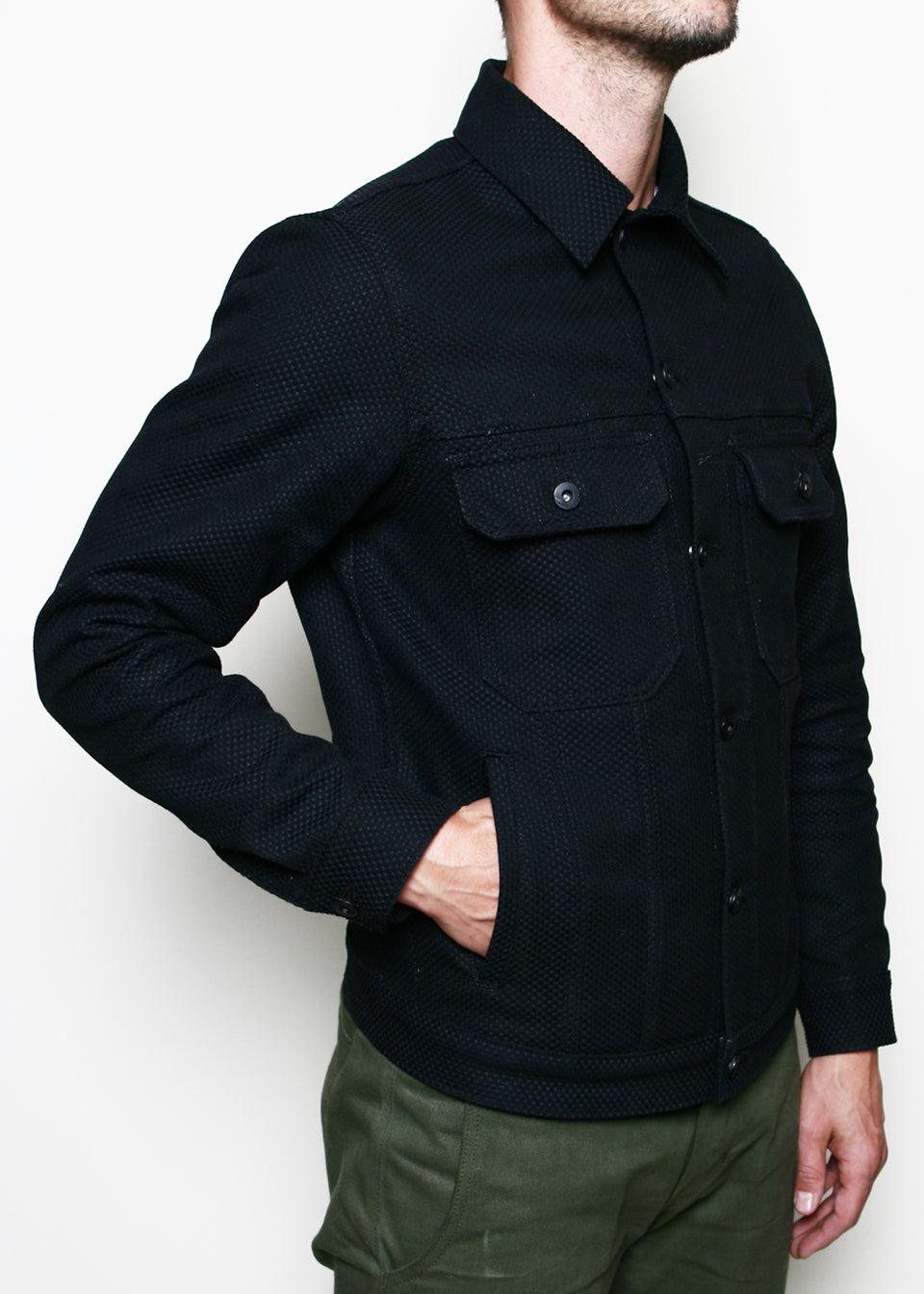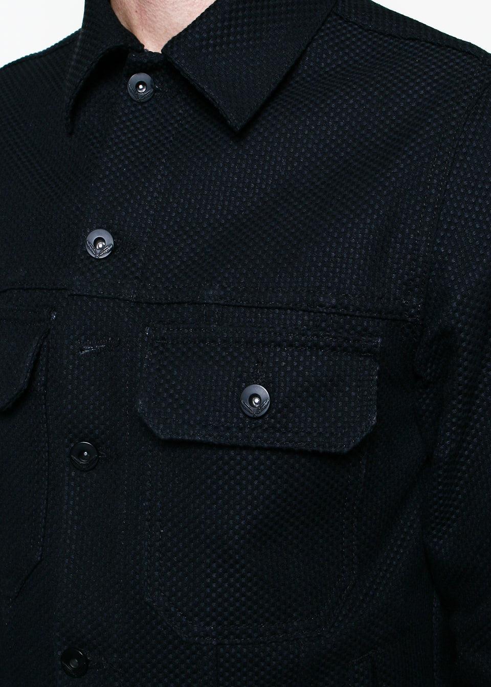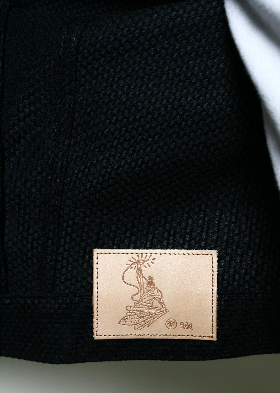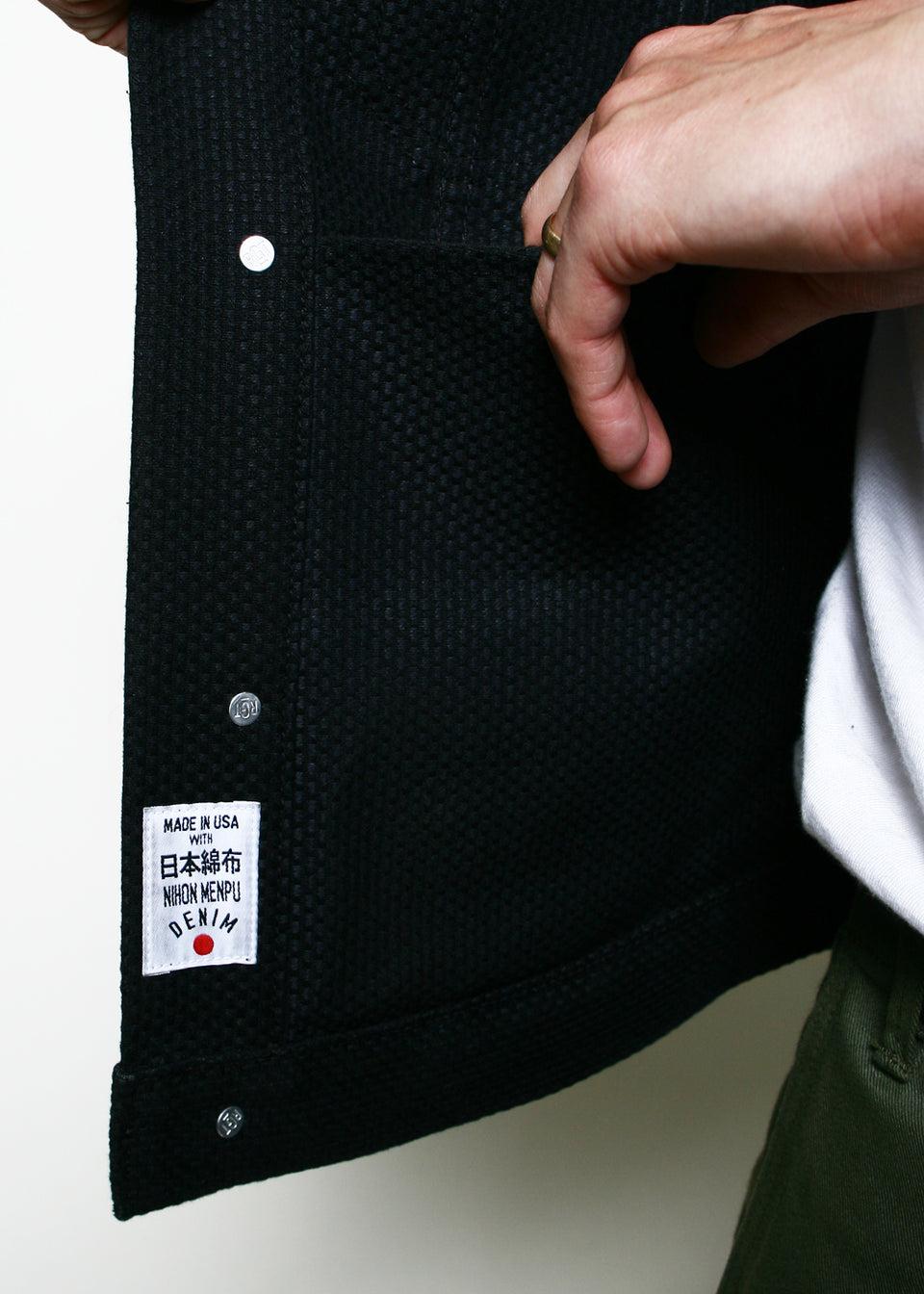PRE-ORDER is now closed. Estimated ship date is early November. FIT // Slim Fit FABRIC // 15oz black sashiko from Japan – 2 large chest pockets w/ flaps– 2 handwarmer pockets– 2 large interior pockets– Chain-stitched side seams– Matte black crossed feather branded buttons– Hand branded leather patch– Sewn in Los Angele