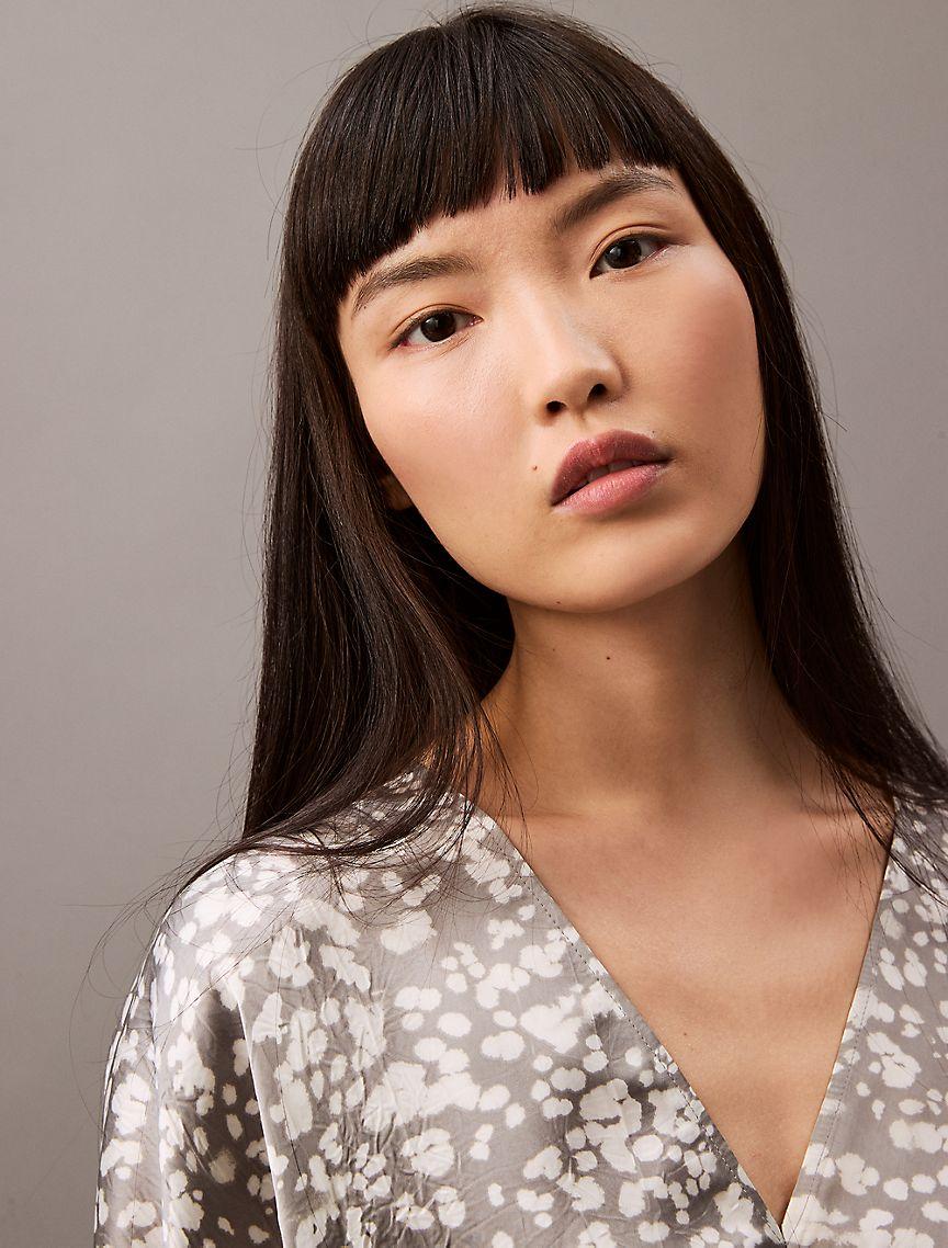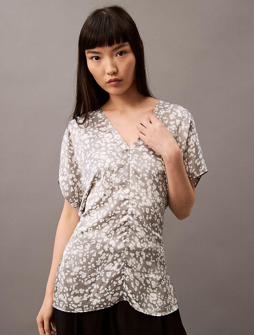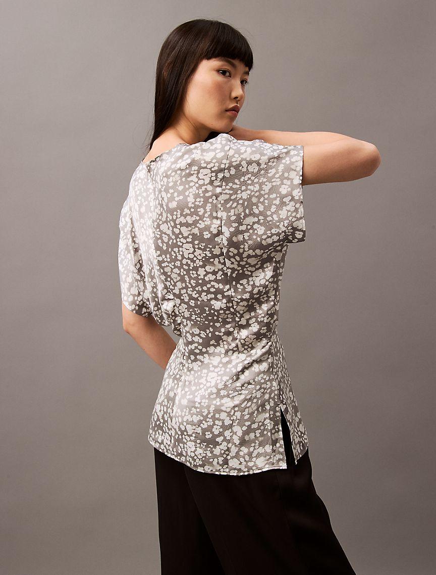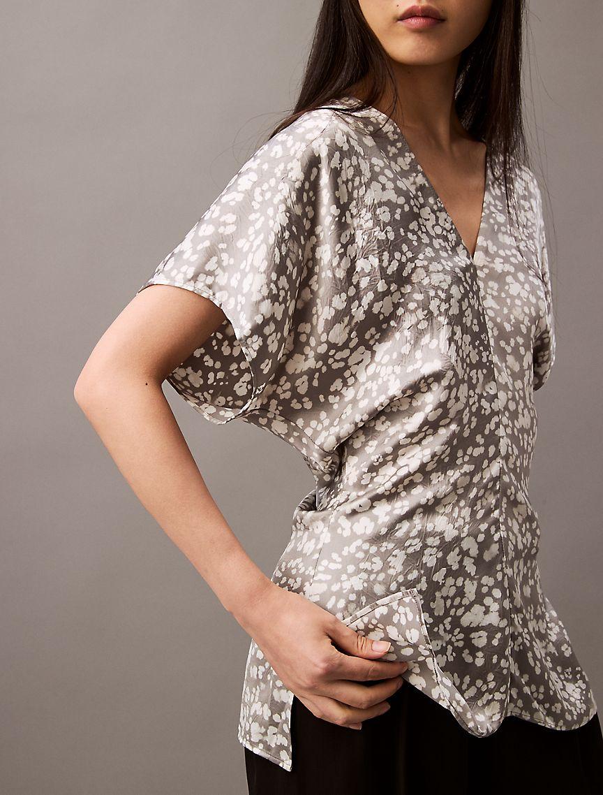 Lightweight in smooth satin, this printed blouse has short dolman sleeves and a v neck. Split at the hem at both sides and tailored with darts at the back. Detailed with a concealed back zip closure.