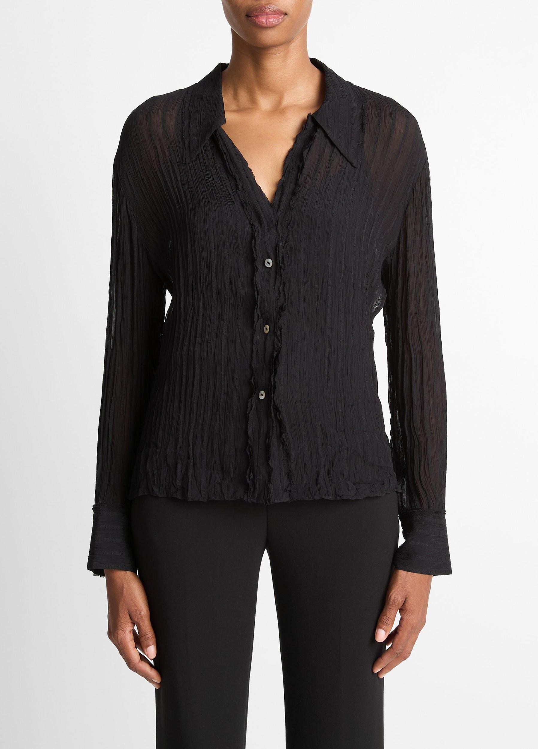 Hints of romanticism pervade our lineup this season. See the raw ruffled trim that frames this sheer, crushed stripe button-front shirt. It pairs back to our matching layered skirt, but the slim silhouette also tucks effortlessly into your favorite denim or trouser.