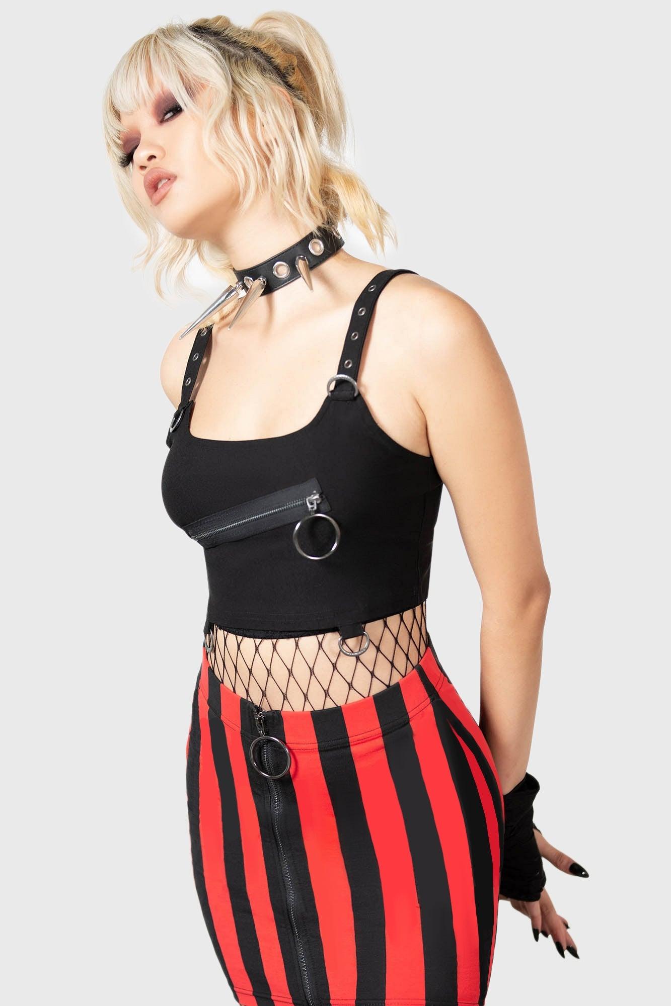 CRUSHING.- Soft, stretch fabric.- Metal hardware.- Statement zip detail.- Adjustable straps with buckle details.- Back zip closure.- Fitted.Model is 5ft 8 and wears a size S.With KILLSTAR branding, 73% Viscose, 23% Polyamide, 4% Elastane.