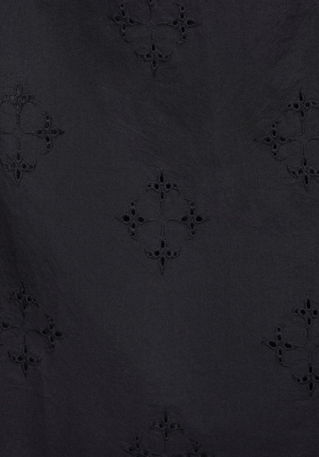 Black Broderie Cotton Midi Skirt Functional button Front Elasticated Waistband Cross Broderie Embroidery 2 Side Seam Pockets Mini Length Lining Main: 100% Cotton Lining: 100% Cotton