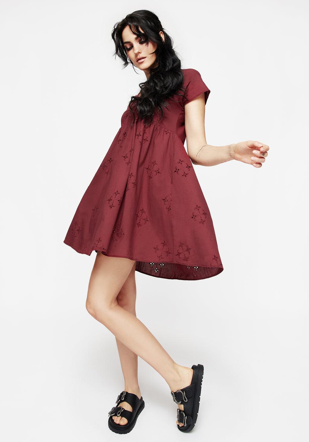 Burgundy Crux Broderie Smock Mini Dress V-Neckline Short Sleeves Mini Length Two Side Pockets 100% Cotton Brianne is 5'7" and is wearing a UK6 / US2