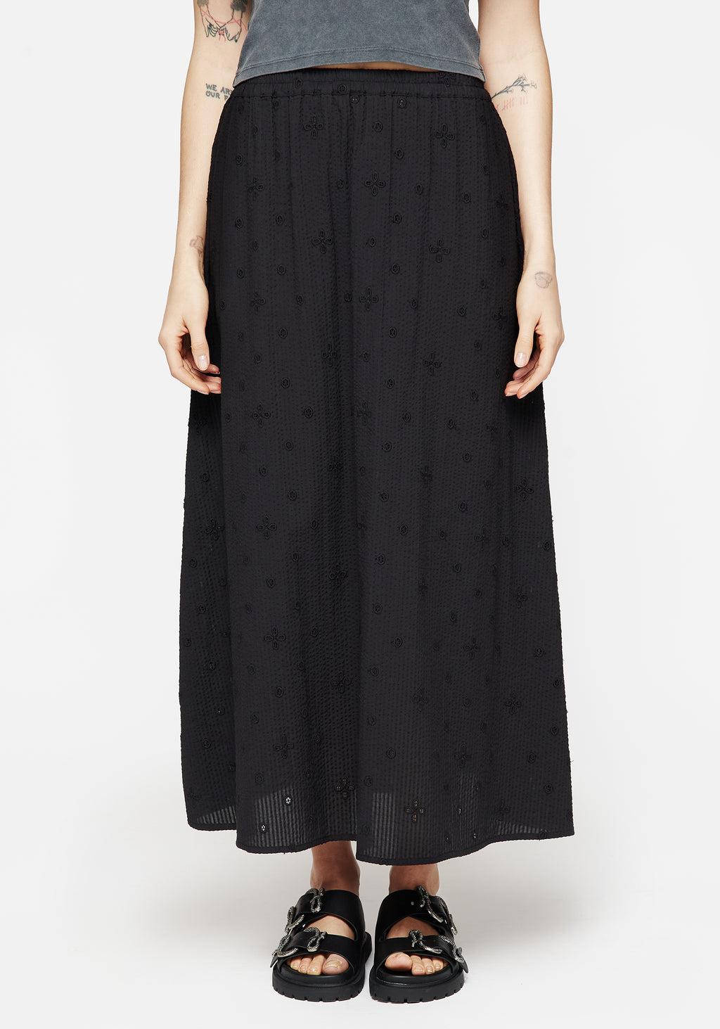 Black Crux Broderie Midaxi Skirt Elastic Waistband Midaxi Length 100% Cotton Brianne is 5'7" and is wearing a UK6 / US2
