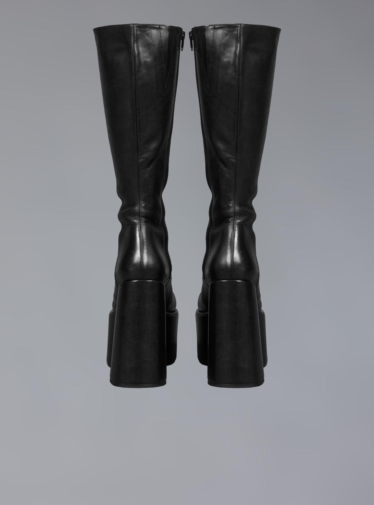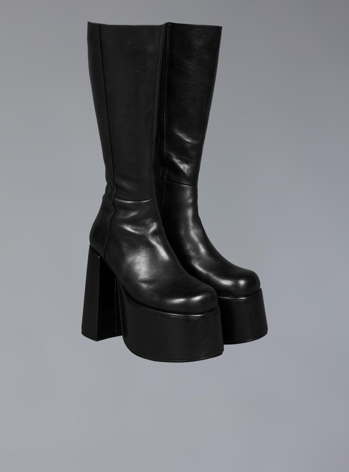 Stacked leather platform boots with inside zipper for easy access. Leather is super soft and will break out with wear. If you are a 1/2 size we recommend sizing up to the next biggest size. Front Platform height: 2.5" Heel height: 5.5" Circumference for size 6 opening is 14 inches, and grades up or down 1/2 inch for each size. Click Here for a printable size chart (make sure you print at Actual Size to ensure accuracy) For any questions about sizing please reach out to our team ~