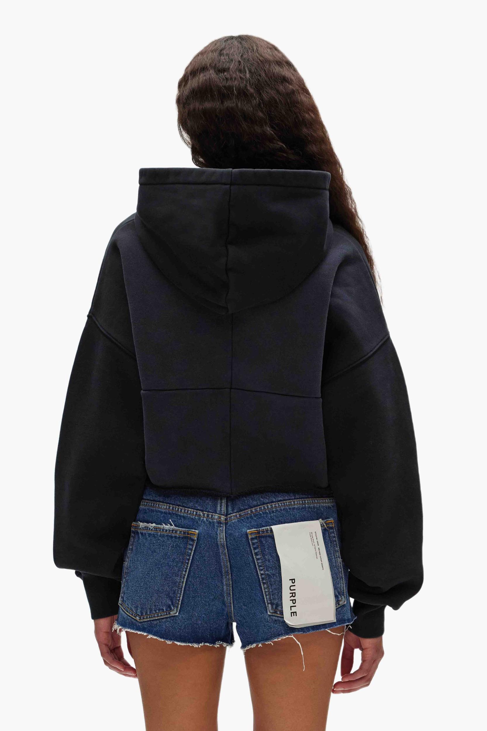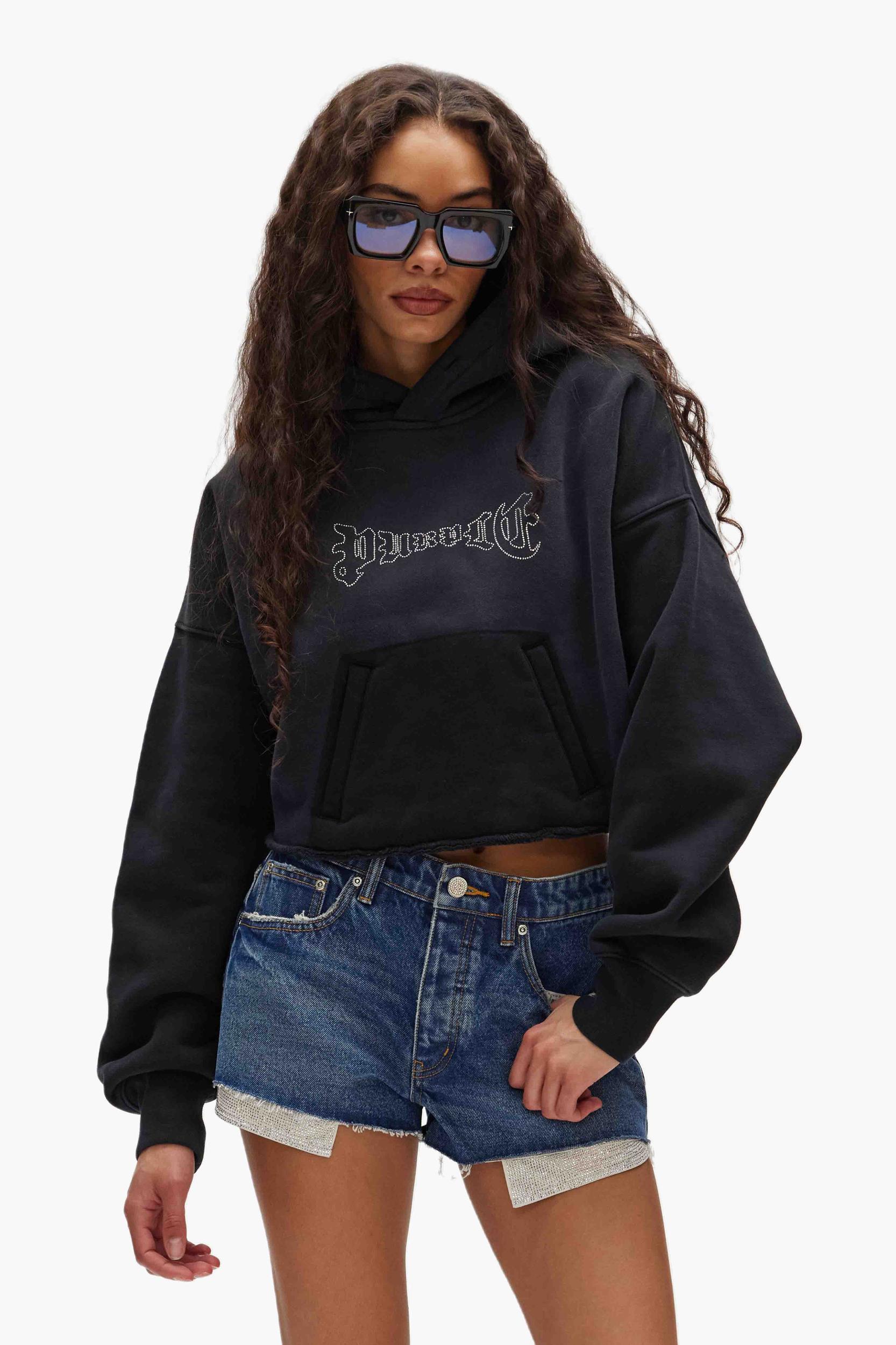 Made of heavyweight cotton fleece, this hoodie is designed for an oversized fit, with a large kangaroo pocket, a raw-edged cropped hem and Purple brand lettering across the chest studded in hotfix crystals. Spring Summer 2025 White Label 100% Cotton Raw Hem