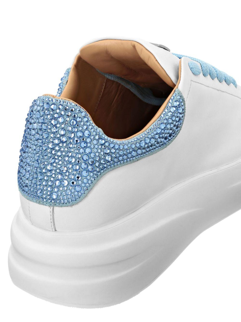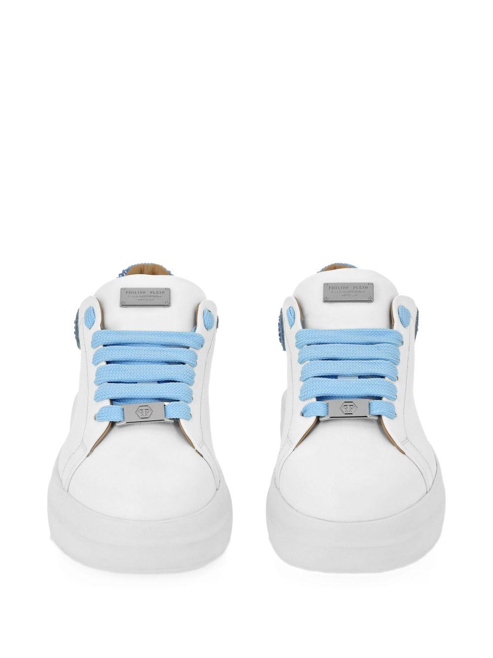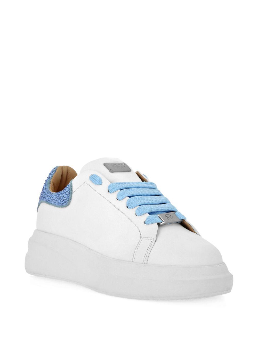 Philipp Plein crystal-detail platform sneakers | White | crafted in white | features a shimmering blue crystal detail at the heel | includes striking blue laces | designed with a chunky platform sole | equipped with a classic lace-up fastening | Calf Leather/Calf Suede/glass/Calf Leather/Synthetic Rubber | Low-Tops | Trainers | Shoes | Women