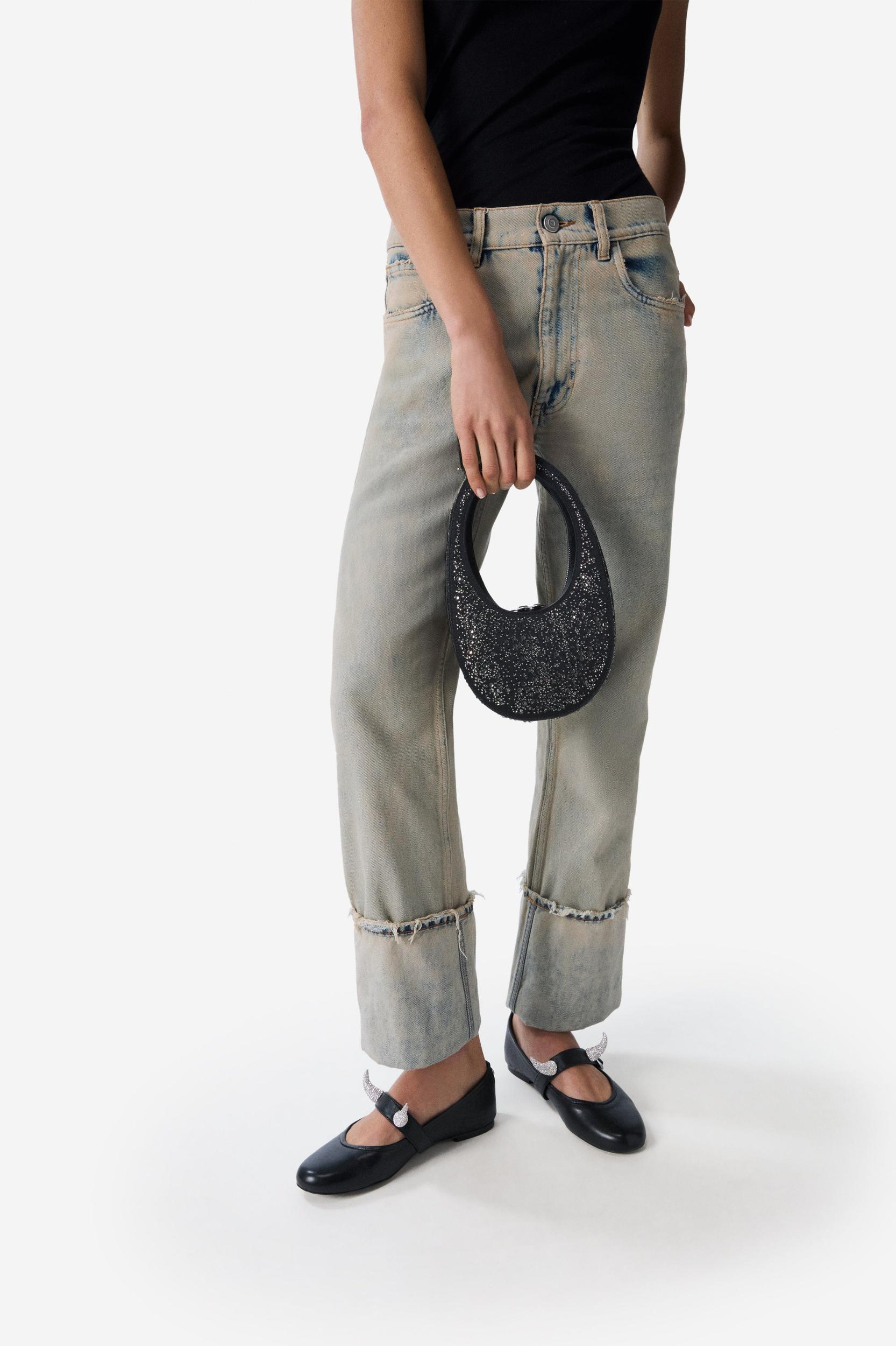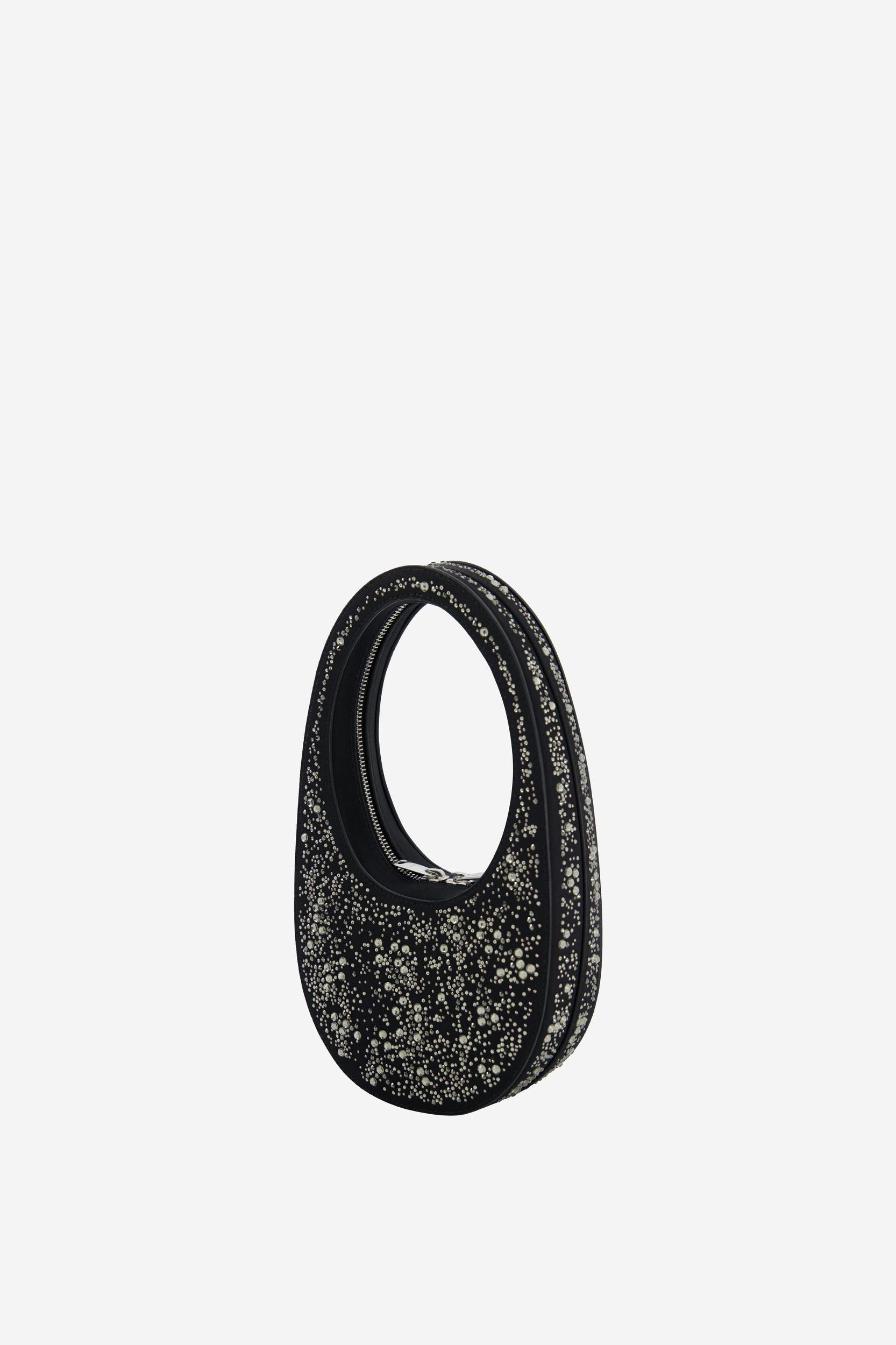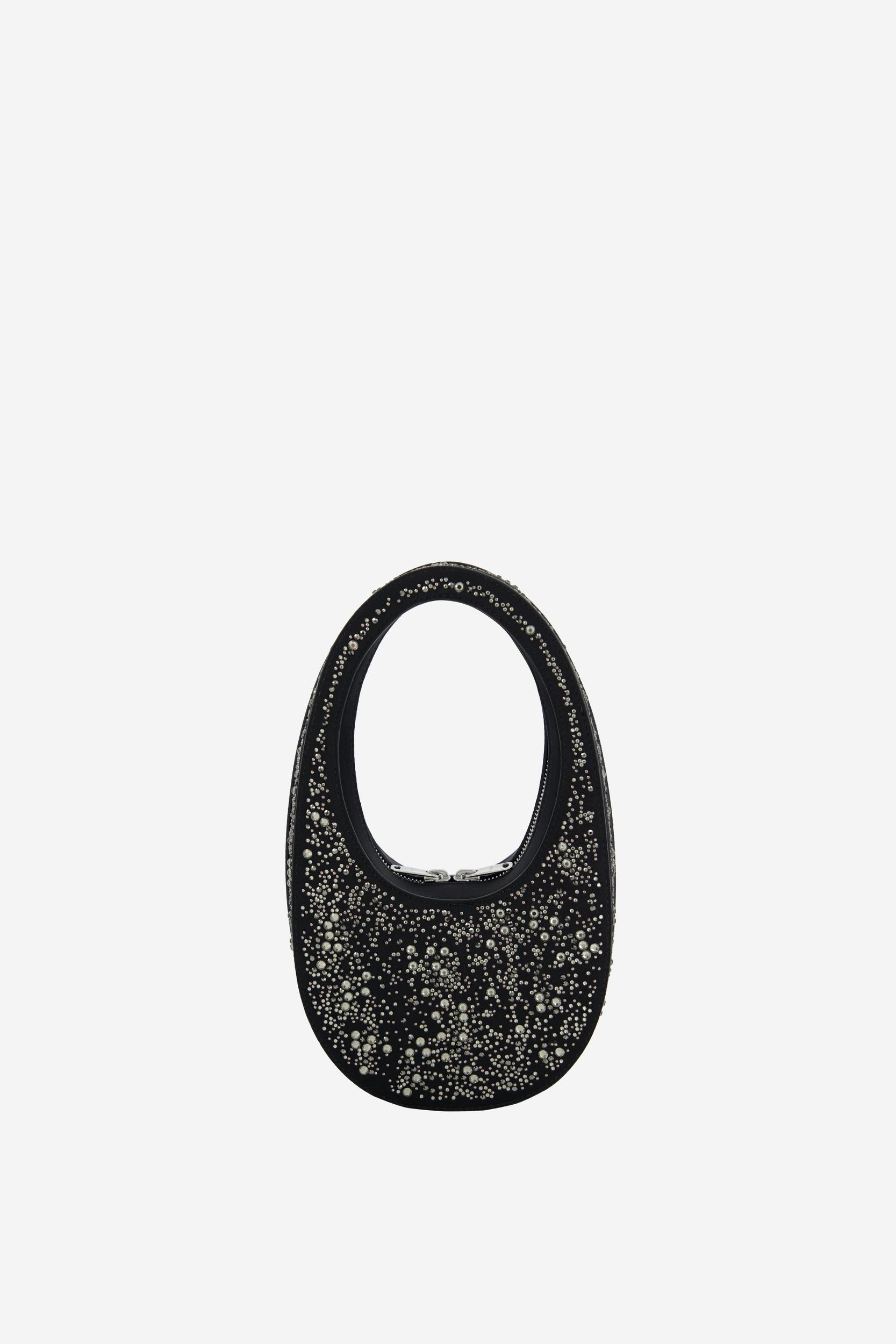 Festooned with assorted crystal embellishments, this black faux suede mini version of the classic Coperni Swipe bag sparkles from every direction like a cosmic light show. In keeping with all Swipe models, it has a sleek oval silhouette and a classic 360° hidden zip on the reverse side of the handle.