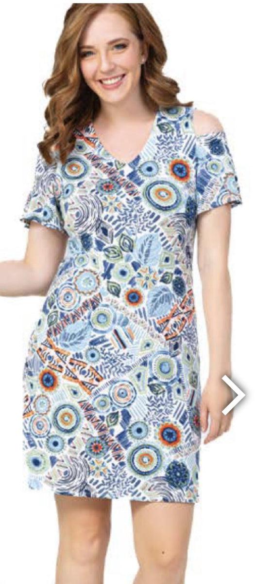 This dress has an all over print front and back and a V neckline. It boasts a slight;y A line cut which makes it fitted in only the right spots. Falls below the knee, made in Canada and easy care. Machine was and dry , 95%rayon and 5% spandex