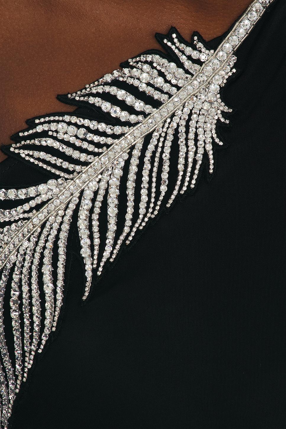 dressSelf 1: 100% viscoseSelf 2: 100% glass / Made in United Kingdom / Dry clean only / Unlined / Rhinestone embellished collar with lobster clasp closureHidden side zipper closure / One-shoulder design / Rhinestone embellished feather at necklinePlease note: gloves are not included. / Jersey fabric with front slit / Our Style No. DAVF-WD393 / Manufacturer Style No. PF24DK37DL / Model is wearing size UK 6.