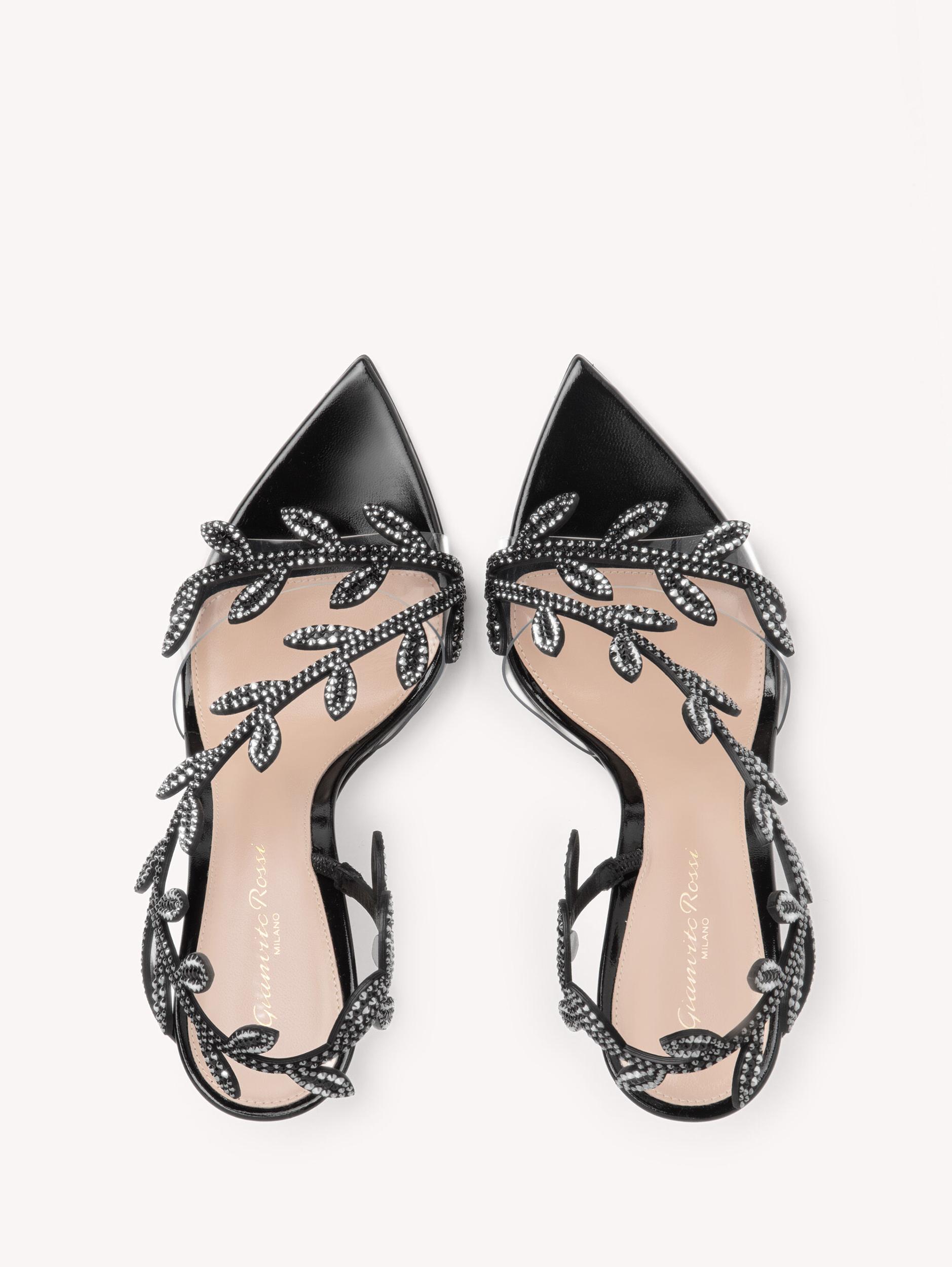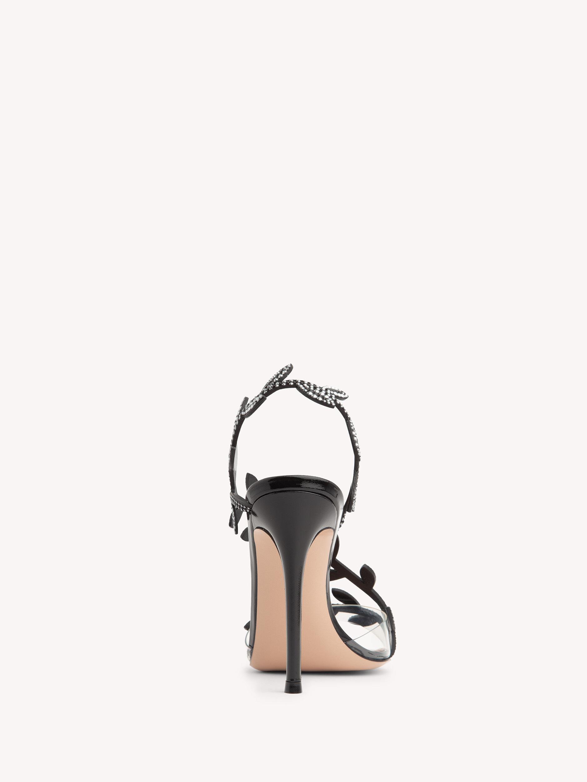 Crafted from suede and enriched with precious crystals, Crystal Flavia is a pointed-toe asymmetric sandal with a 105mm stiletto heel. The upper presents a laser-cut leaf motif and a front toe band in soft see-through Plexi. Handmade in Italy.