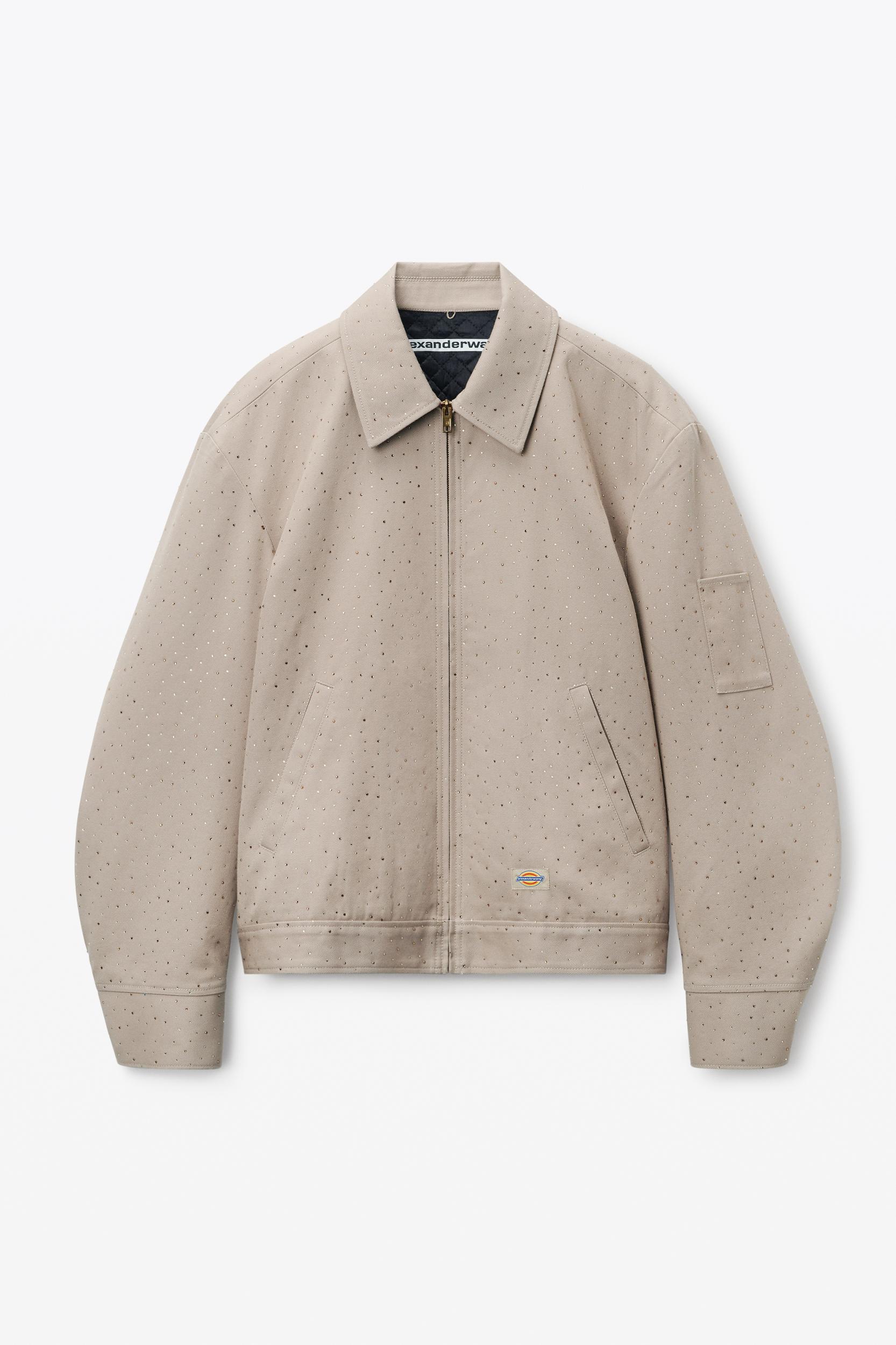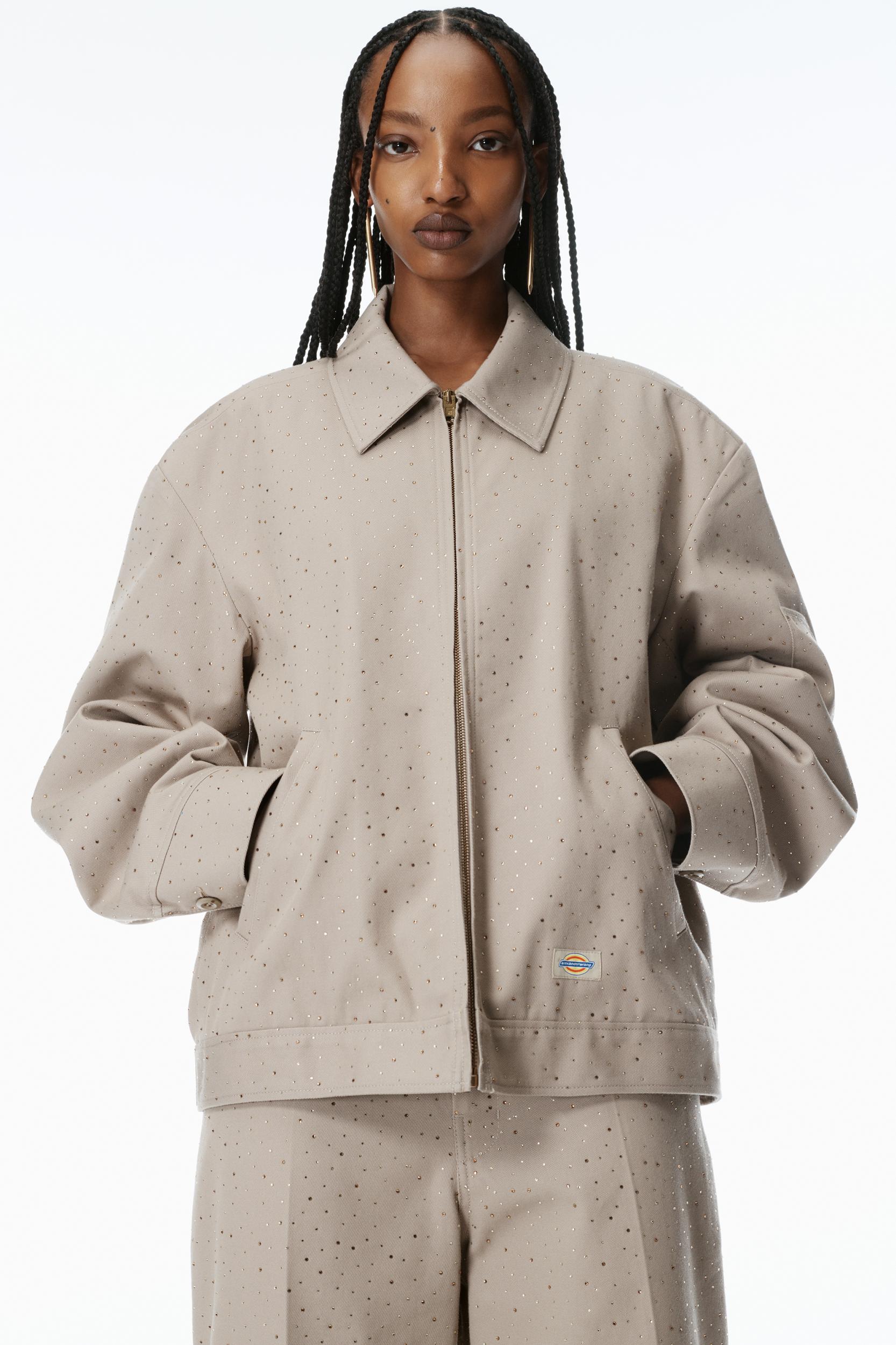 Tonal crystal hotfix animates this workwear-inspired jacket crafted of enduring cotton drill. Its quilted lining helps shape and structure the silhouette. This outerwear style spotlights logo detailing, welt and patch pockets, and a vintage-effect zipper.