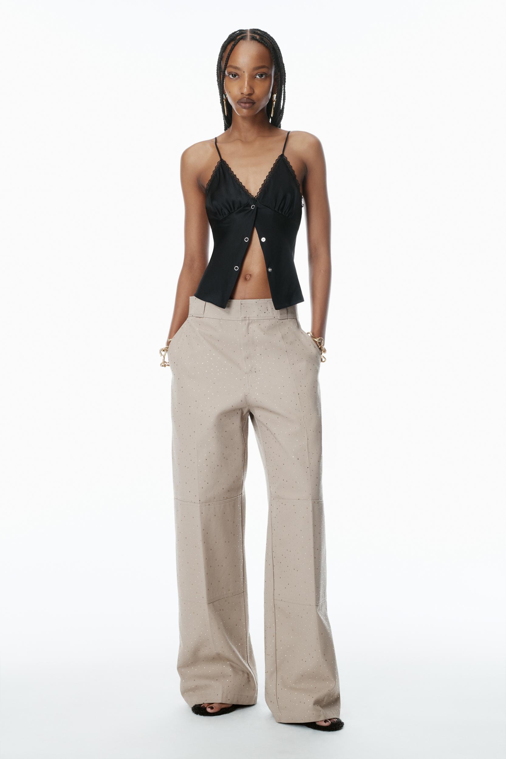 Tonal crystal hotfix animates these khaki workwear-inspired pants crafted of enduring cotton drill. Patch seaming at the knee accentuates the shape, while wide belt loops and a creased front lend a tailored nuance.