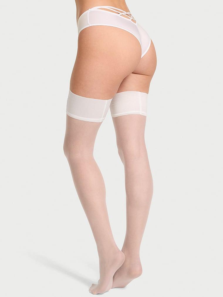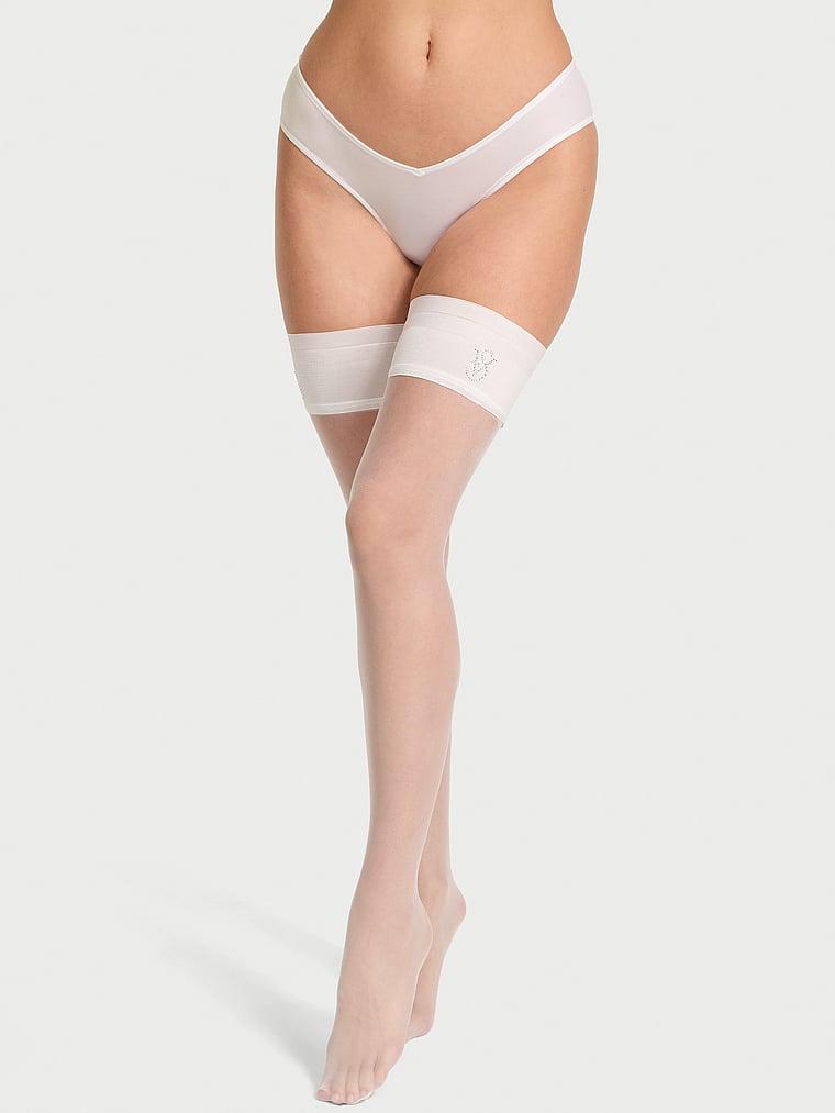 It'll be our secret. The initials VS, spelled out in rhinestones, bring a little hidden glitter to the wide, comfy bands of these thigh highs, available in a variety of bold colors. Note: These will need a garter belt to hold them up.