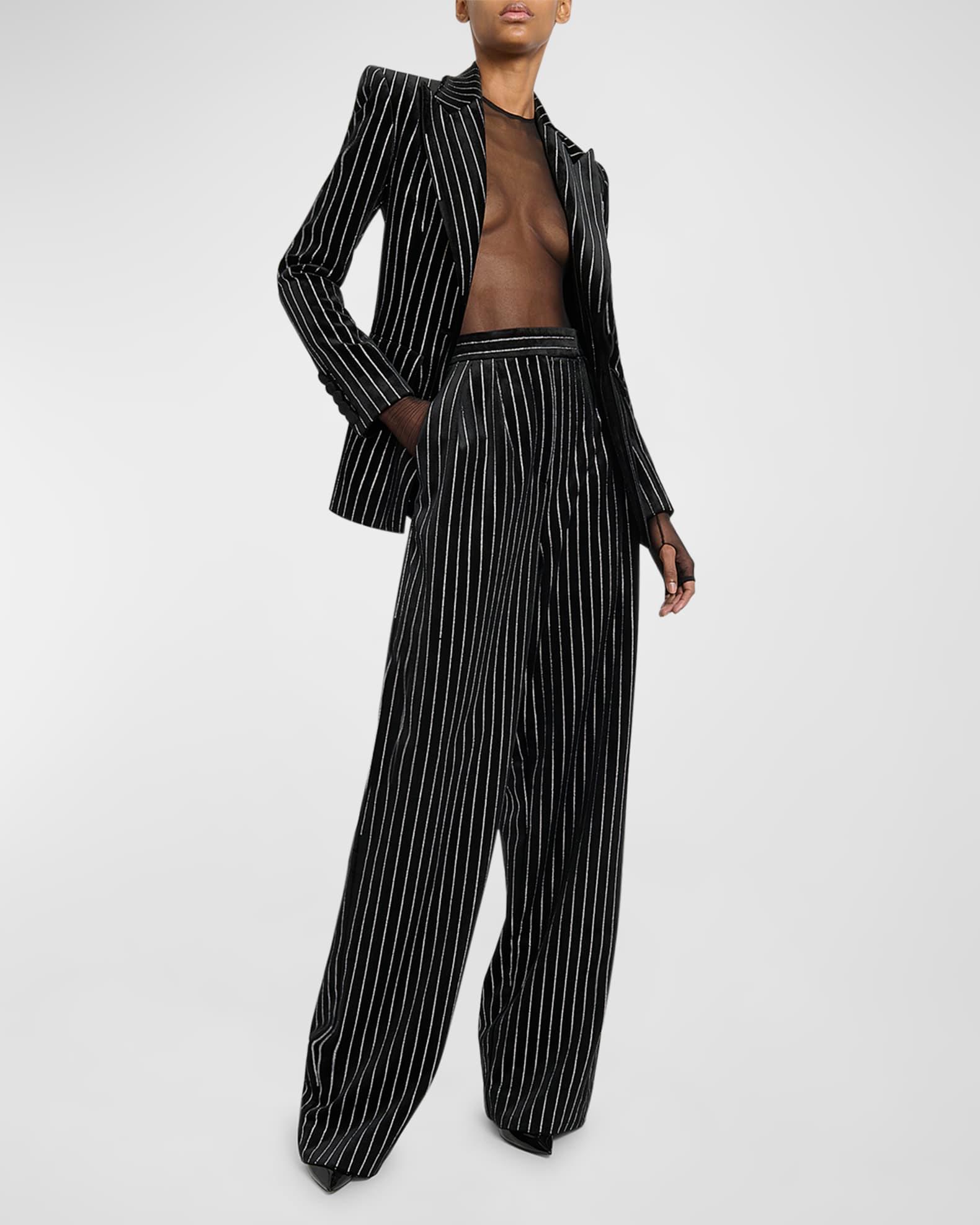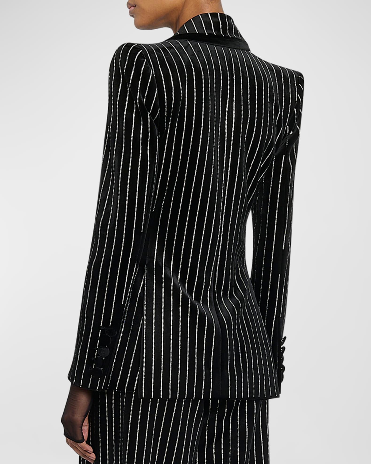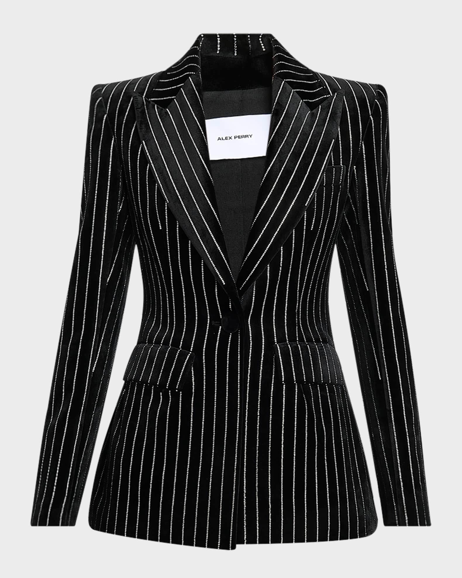 Alex Perry velvet blazer featuring crystal pinstripe embellishment and padded shoulders Peak lapels; single-breasted front Long sleeves; button cuffs Chest welt pocket; side flap pockets Slim fit Polyester/spandex Dry clean Imported Model is 5'10"/177cm.