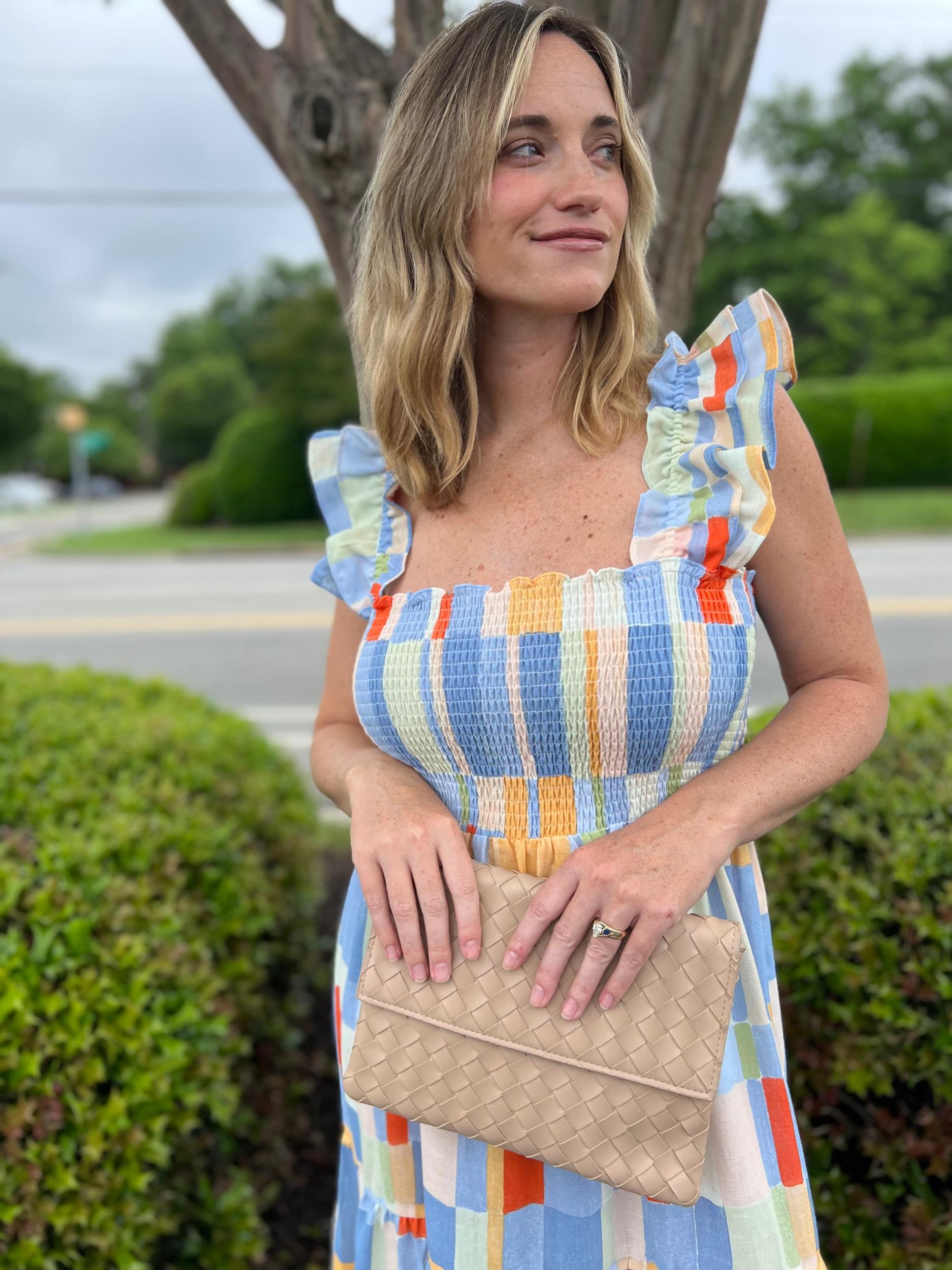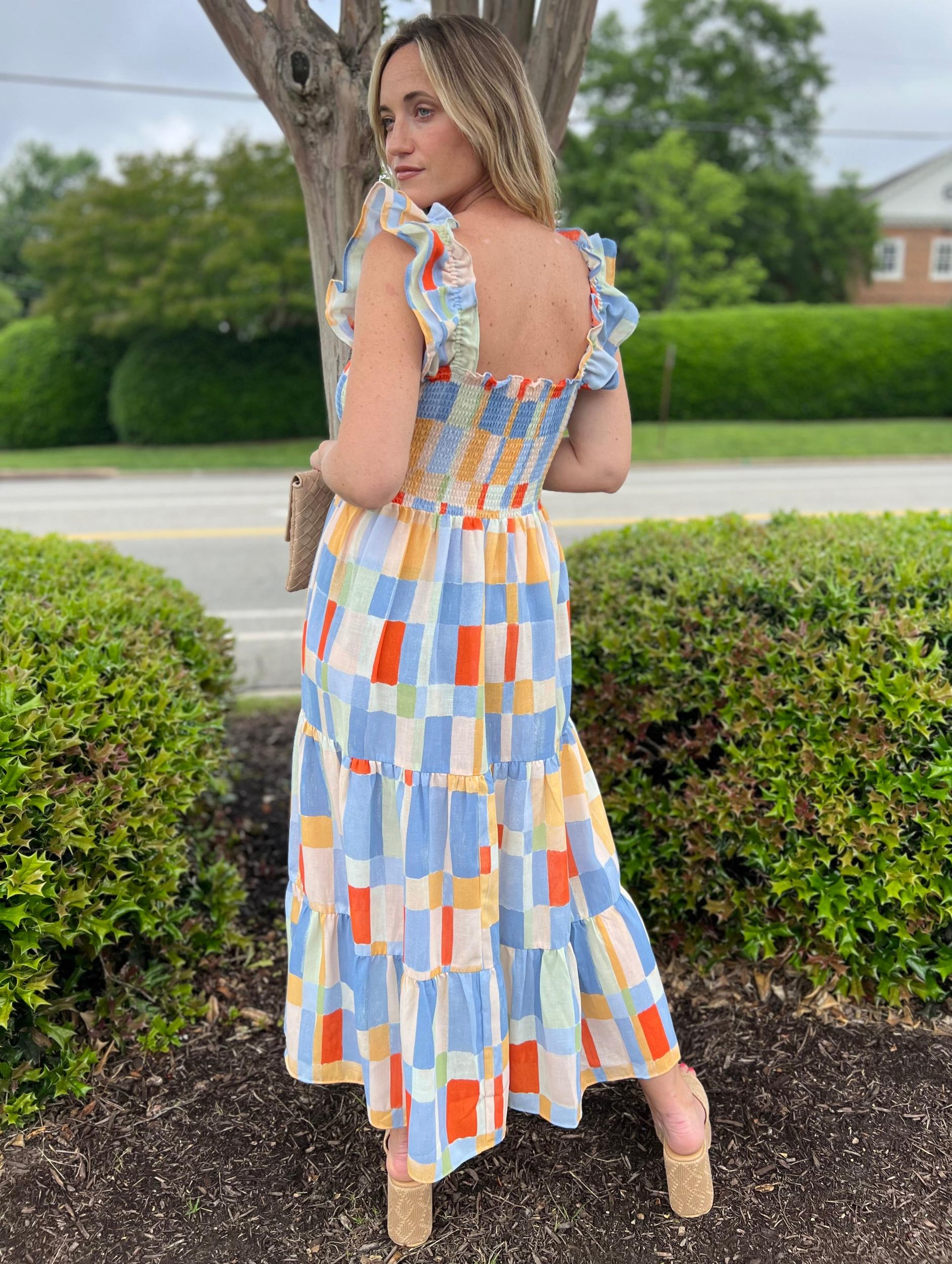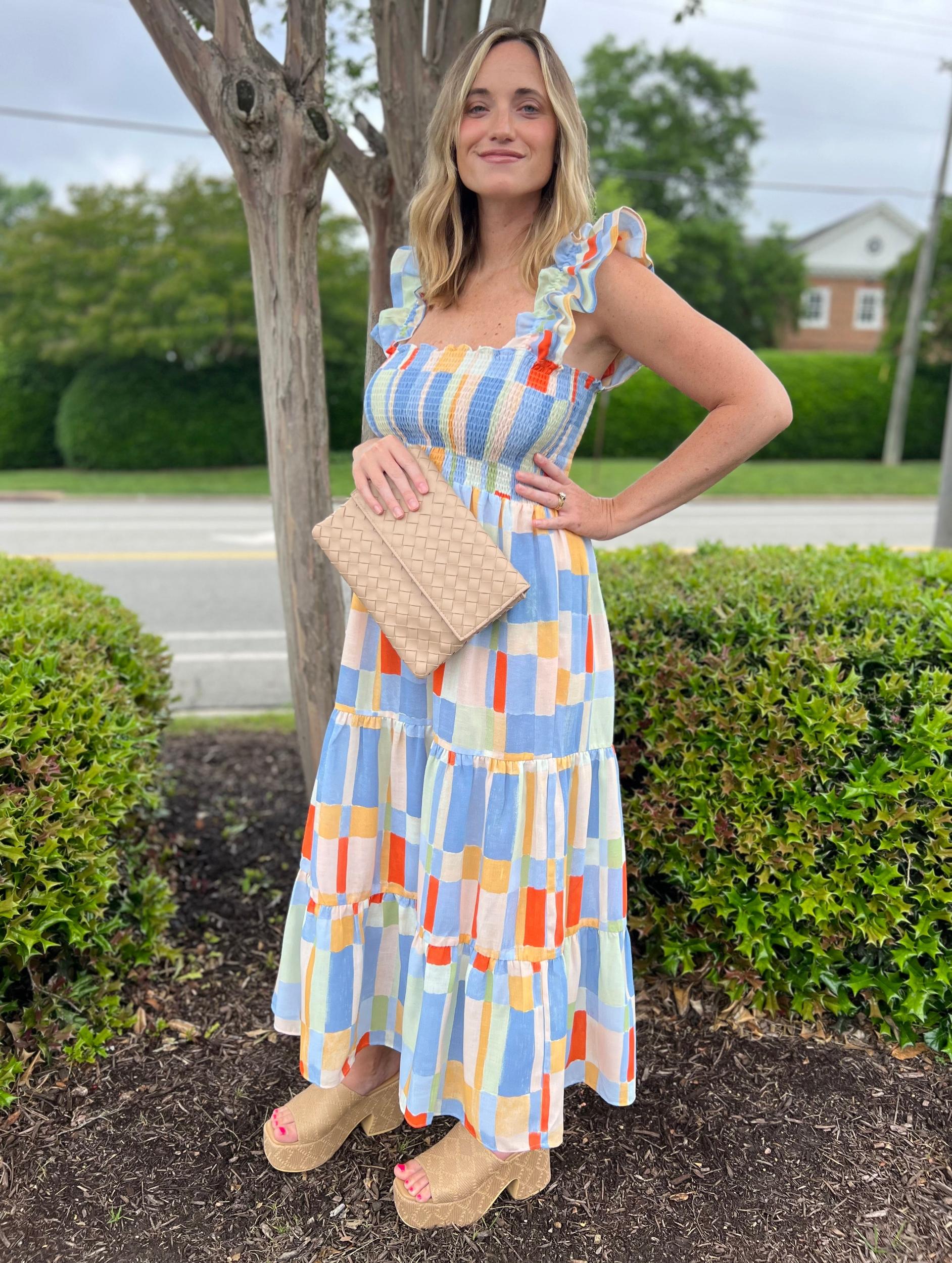 Dress to impress with our Crystal Midi Dress! Featuring a cute geometric print, smocked top for a perfect fit, ruffle elastic straps for a touch of whimsy, and a tiered skirt for added volume. This dress is perfect for any occasion, from brunch to a night out on the town.