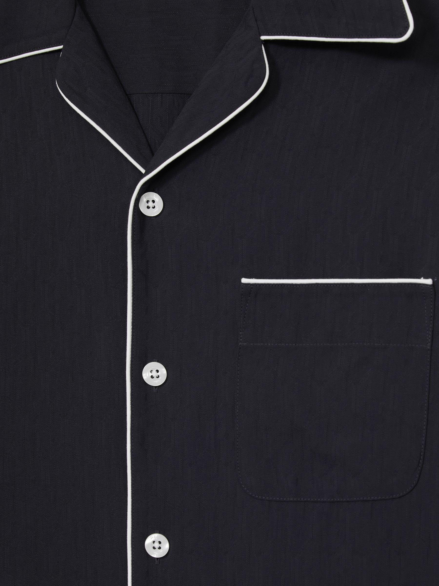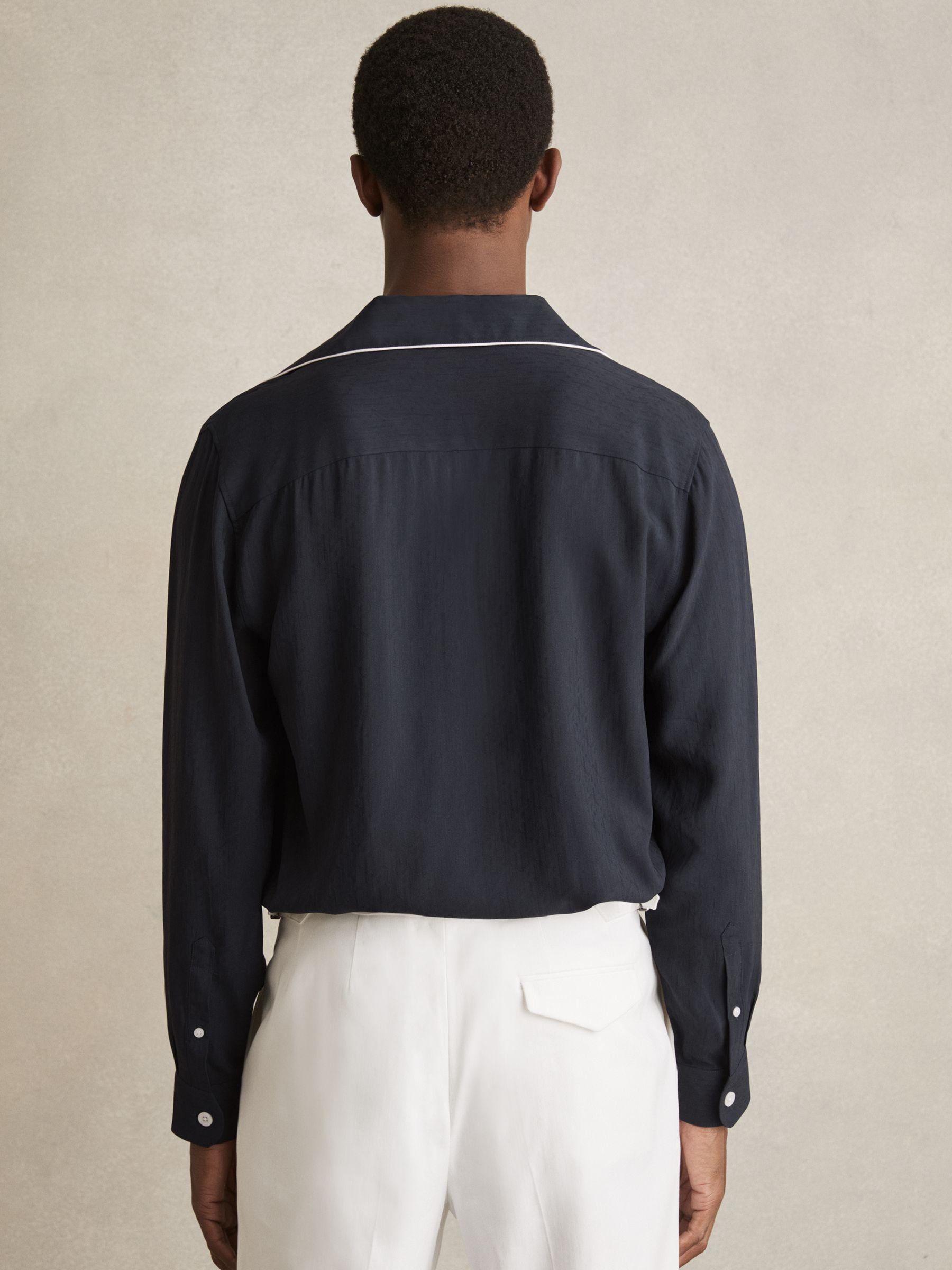 The Josh shirt is crafted from supple lightweight fabric with a soft drape and detailed with contrast piping trims. Cut to a regular fit with a Cuban collar, chest patch pocket and long cuffed sleeves. Piping trims Cuban collar Chest patch pocket Front buttons The model is wearing a size M Measurements of model: Height 6ft 2.5 / 189cm.