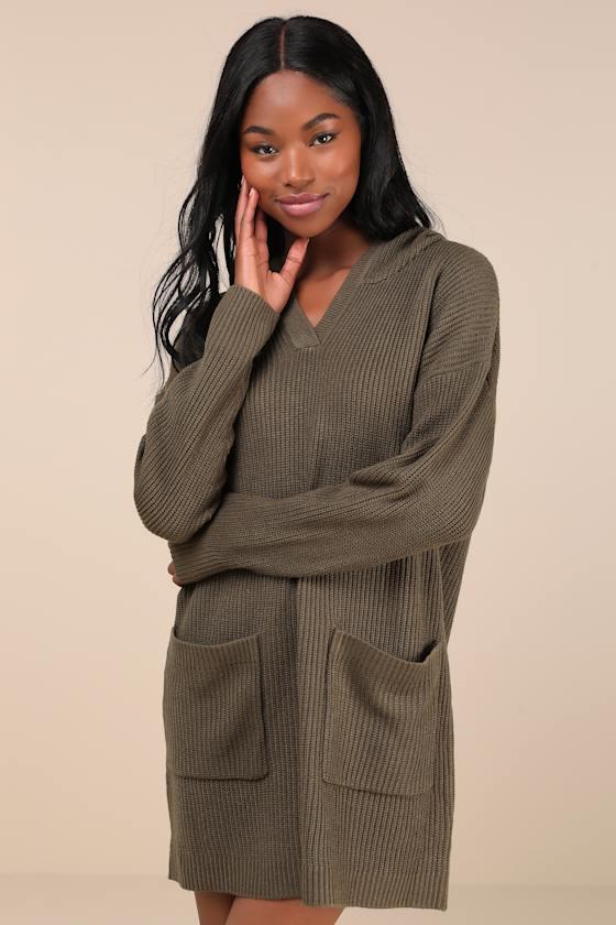 The Lulus Cuddled Up Days Olive Green Hooded Mini Sweater Dress is the best way to stay as cozy as you are stylish this season! Soft and chunky sweater knit shapes this winter-ready dress that features a hooded, relaxed bodice with a notched neckline and long sleeves with drop shoulders. The wide-cut silhouette boasts twin, functional patch pockets at the front before ending at a cute mini hem. Ribbed knit accents the neckline, pockets, cuffs, and hem.
