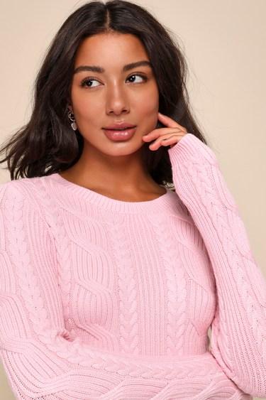 All the happiest memories you make this season are definitely going to involve the Lulus Cuddly Contentment Light Pink Cable Knit Cropped Sweater! This medium-gauge, cable knit sweater is sure to keep you cute all season long with its classic crew neckline, long sleeves, and fitted silhouette that finishes at a trendy cropped hem. Ribbed knit accents the neckline, cuffs, and hem.
