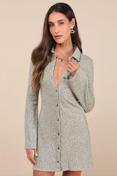 Prepare to look cute all season long with an autumn-ready look like the Lulus Cuddly Sweetness Heather Green Button-Front Sweater Mini Dress! Stretchy ribbed sweater knit (with a trendy heathered effect throughout) shapes this darling dress that features a timeless collared neckline and long sleeves. A functional button placket runs along the center of the flattering, fit-and-flare silhouette that continues down to a flirty mini hem.