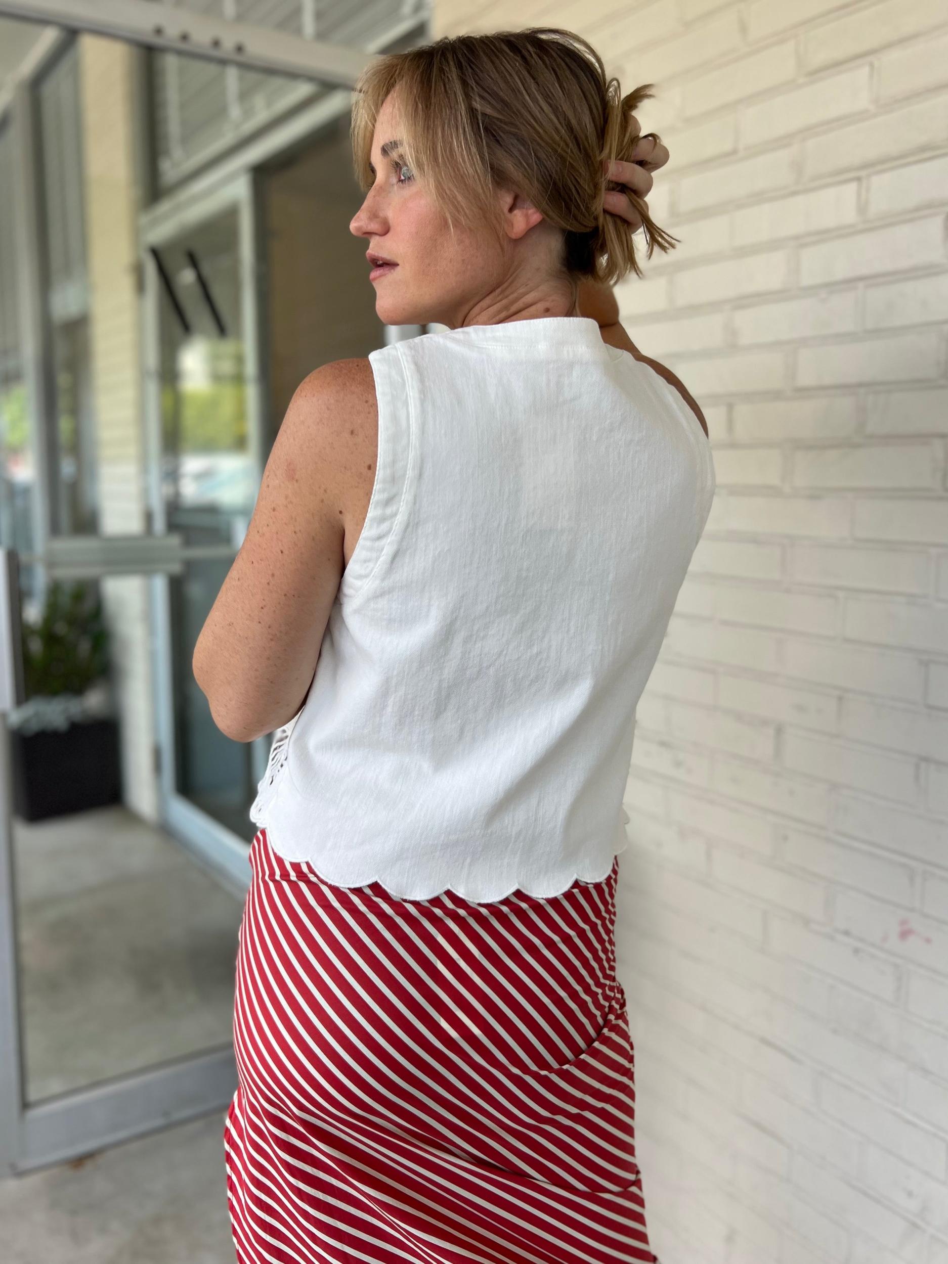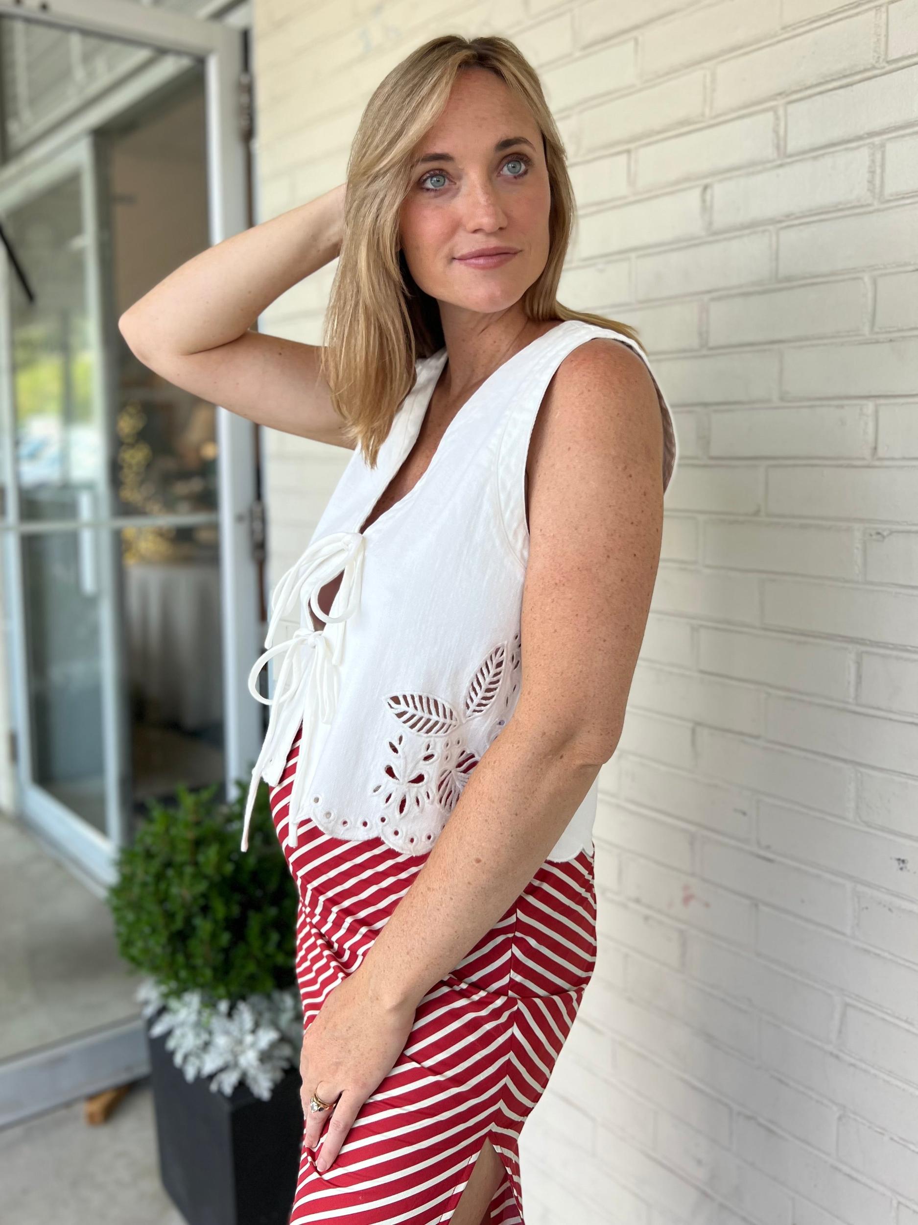 Elevate your layering game with the Cullen Tie Vest! This playful white number features adorable front ties and delicate floral cutouts that add a touch of whimsy to any outfit. The scalloped bottom edges create a fun, feminine silhouette that's perfect for mixing and matching!