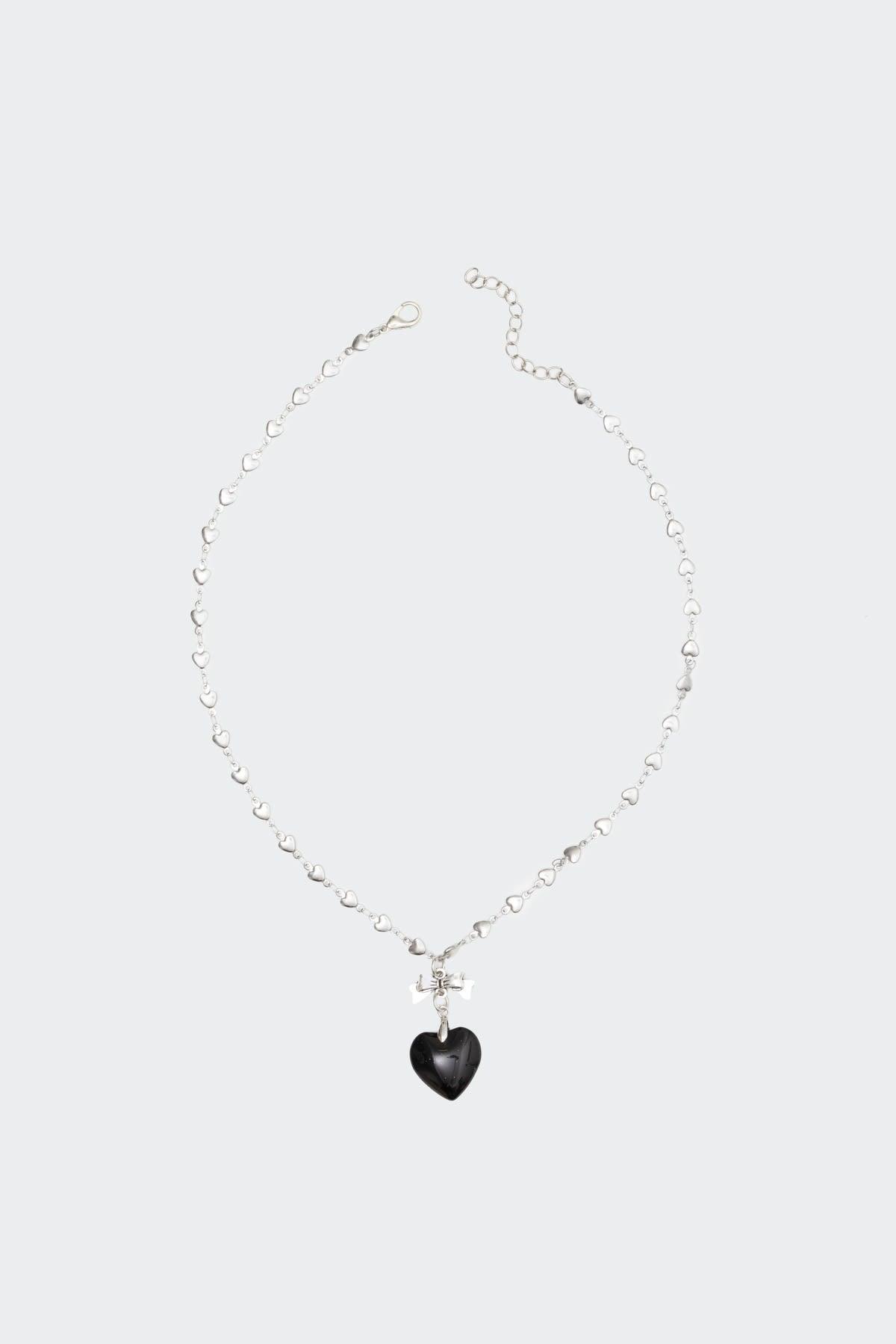 Necklace Mini heart chain Large heart pendant Bow pendant detail Silver tone metal Measurements (In): Length ., Width . Item care: Avoid direct contact with perfume, soap or creams