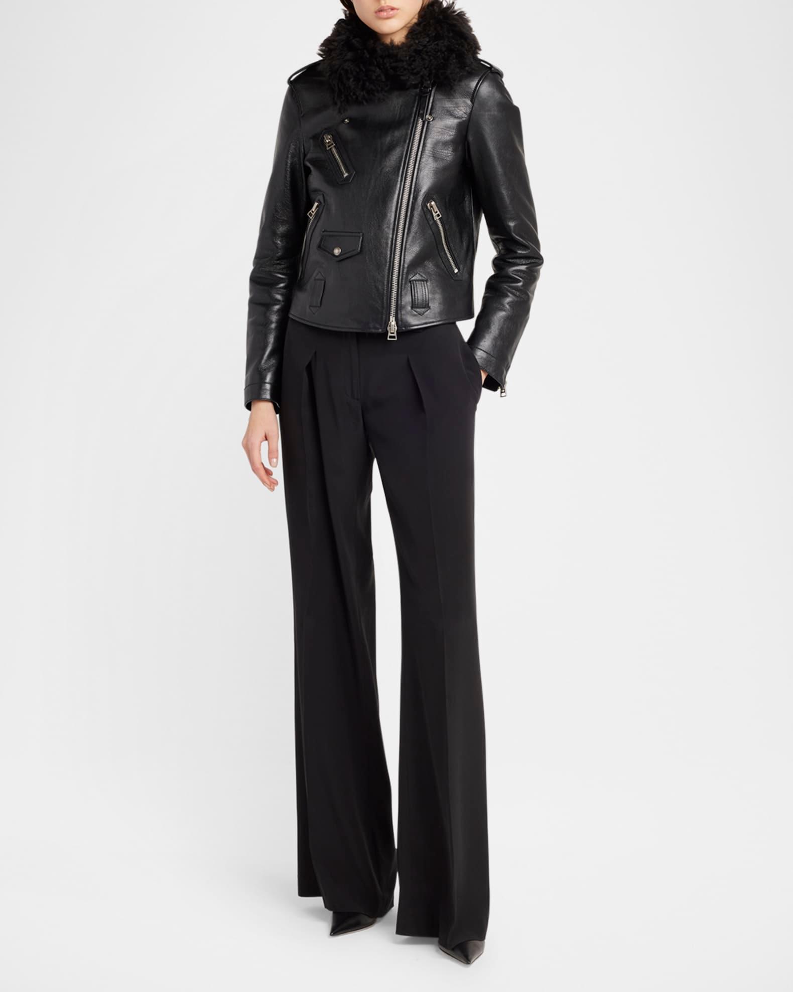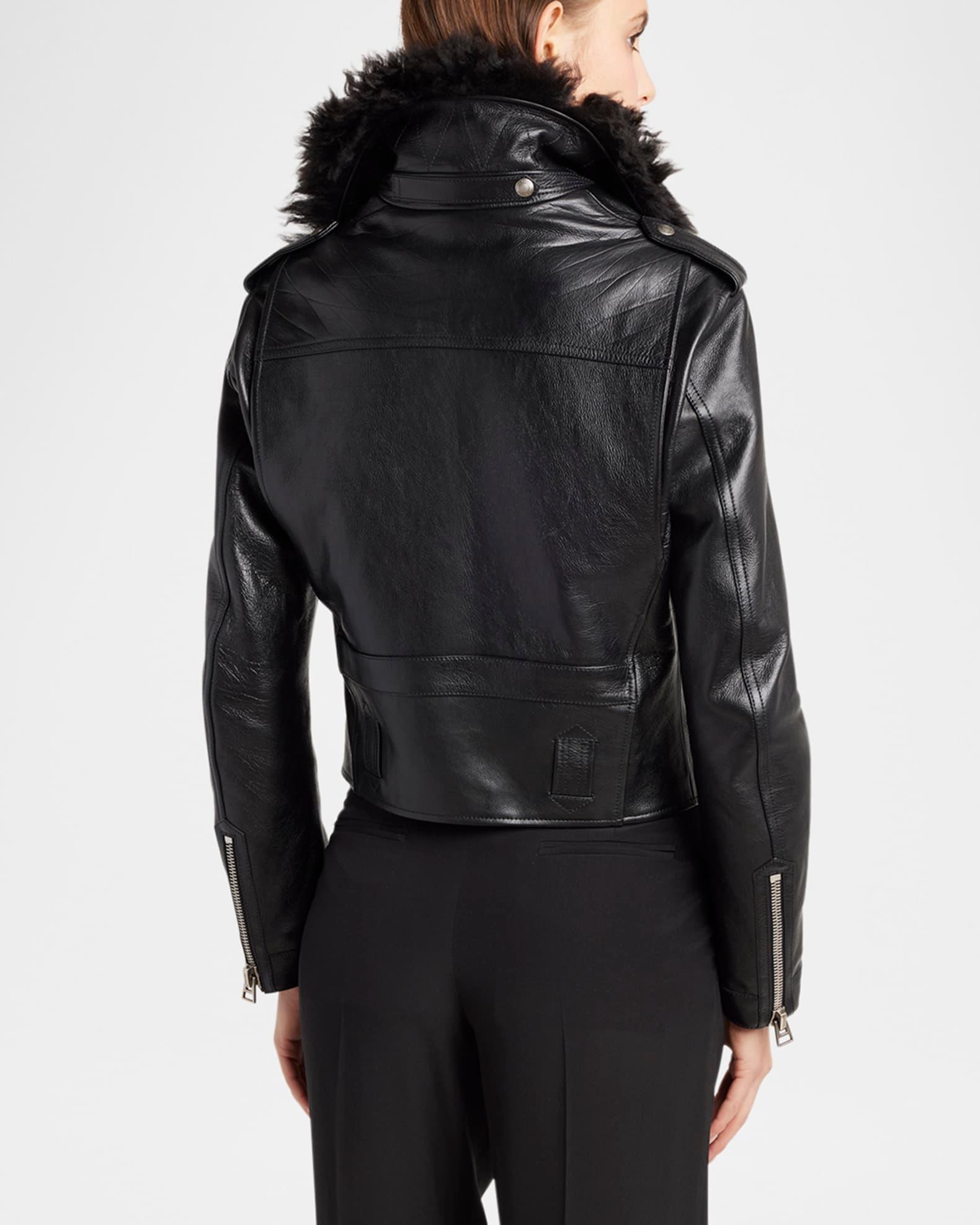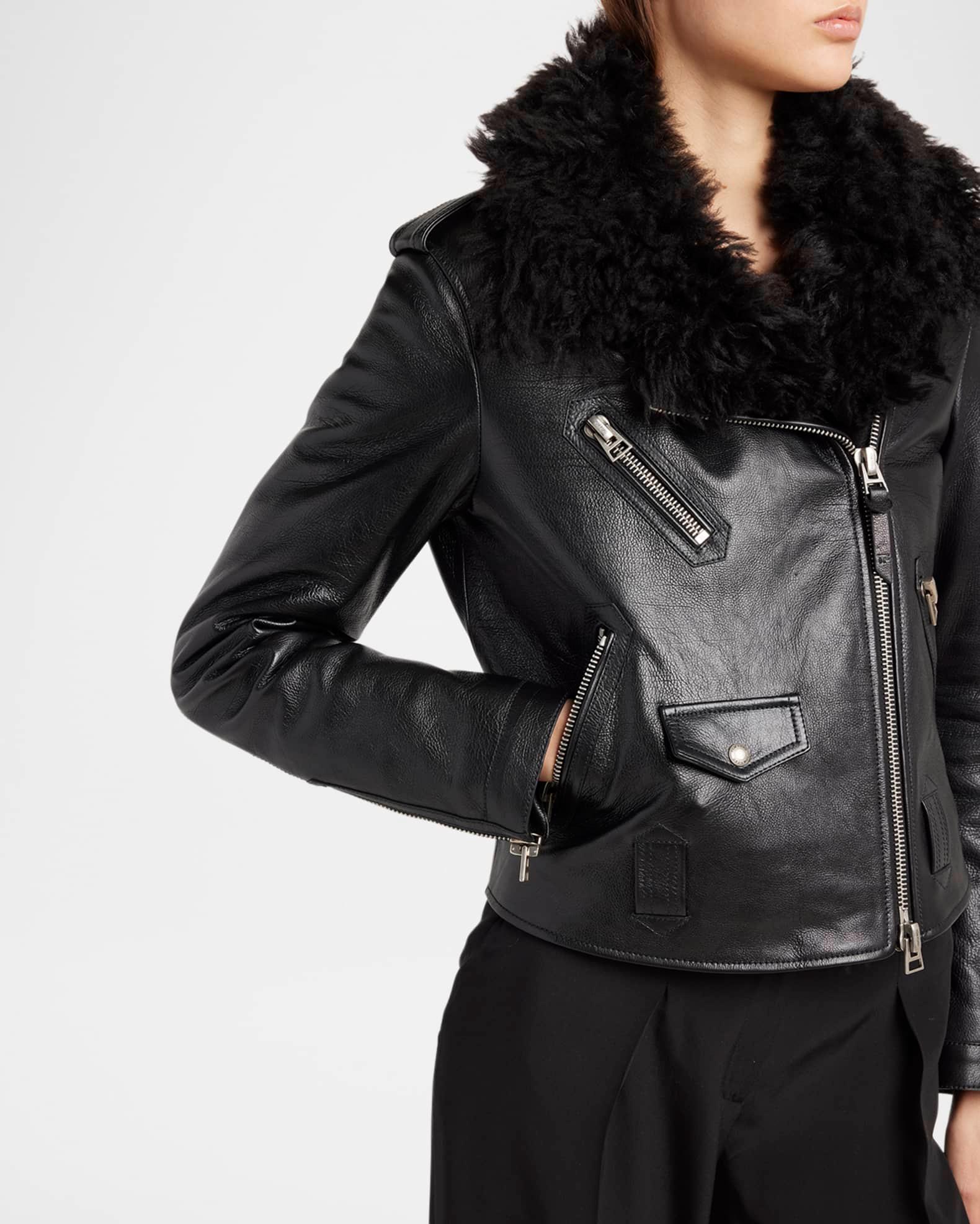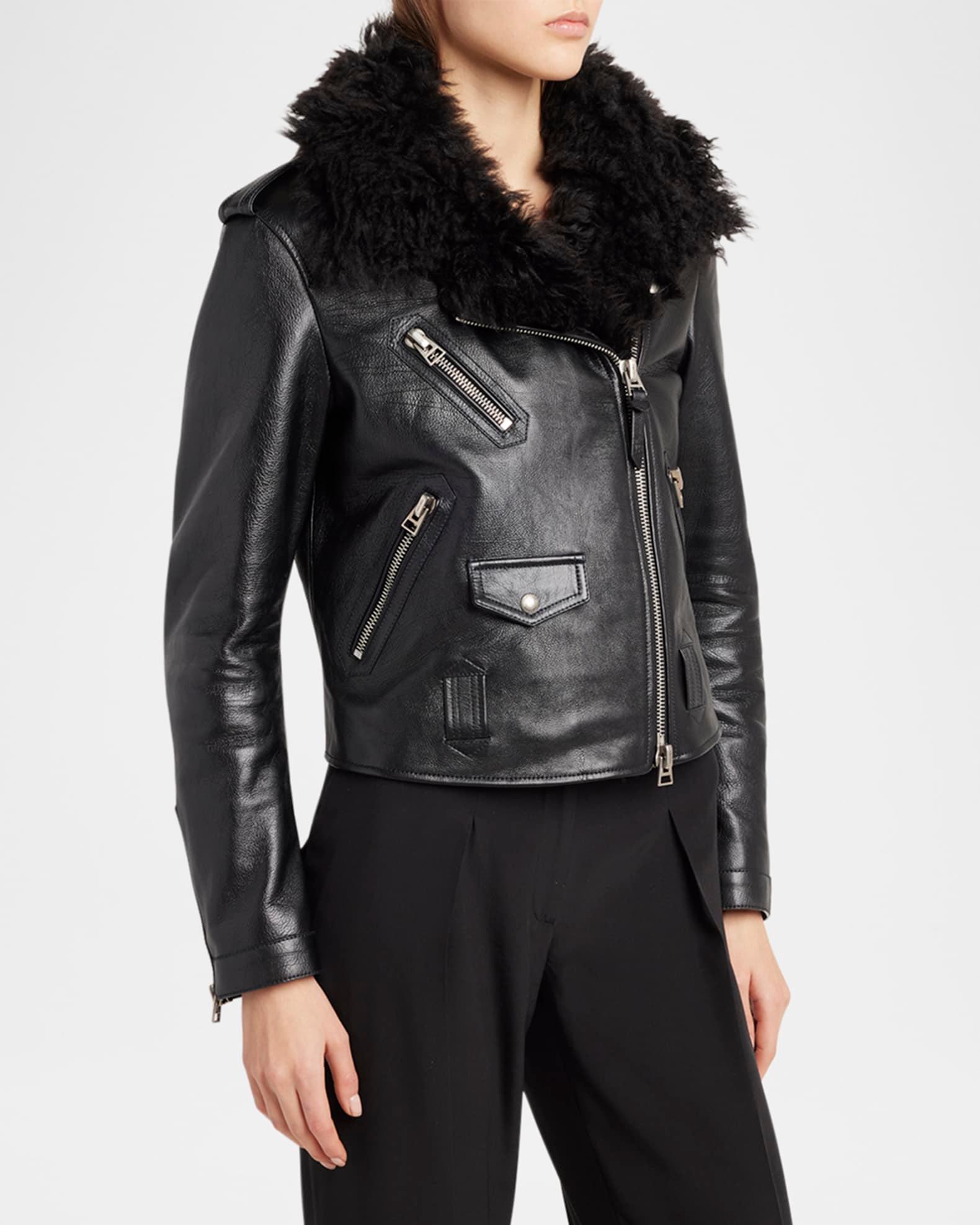 TOM FORD grain calfskin leather biker jacket featuring a natural and dyed curly sheep shearling (Italy) collar Notch lapels; off-center two-way zip front Long sleeves; zip cuffs Shoulder epaulets Chest and hip zip pockets Front snap-flap pockets Straight fit Hip length Belt loop hem Leather/shearling/polyacetelyne Made in Spain