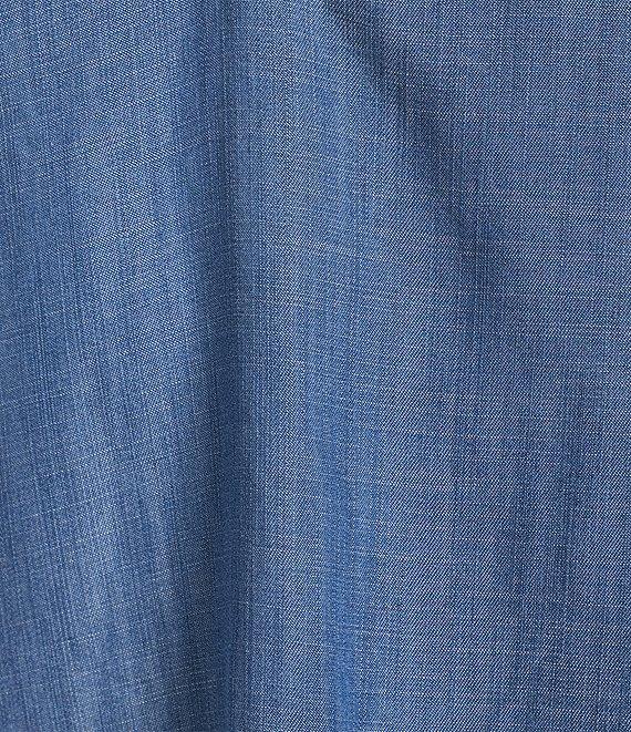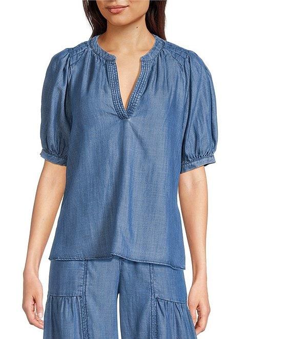 From Current Air, this blouse features: Washed chambray fabrication V-neckline Short sleeves Neck band Pleated detail on shoulder Top stitching on placket Straight hemline Pullover construction Approx. 25" length Lyocell Machine wash cold/tumble dry low Imported.