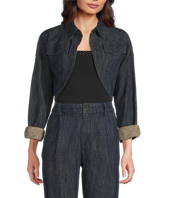 From Current Air, this jacket features: Denim fabrication Cropped length Point collar neckline Long Sleeves Two chest pockets Curved hemline Button front closure Approx. 16.75" length Cotton Machine wash cold/lay flat to dry Imported.