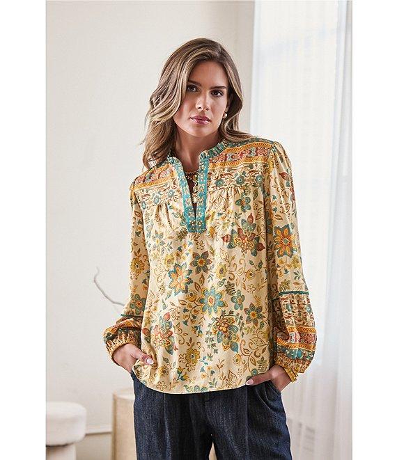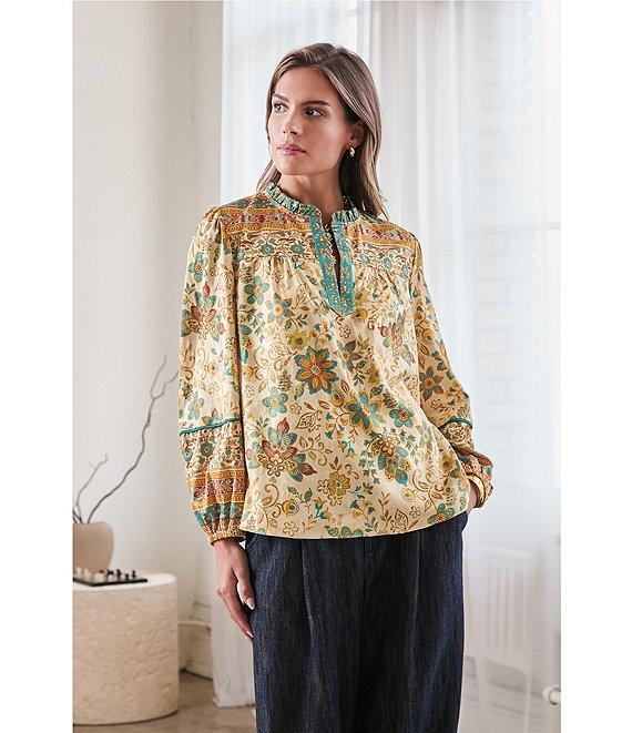 Current Air Floral Ruffled Split Collar Long Sleeve Blouse