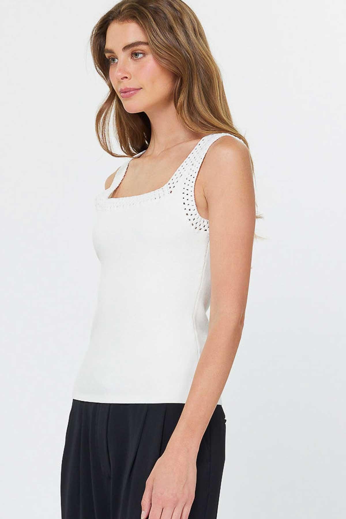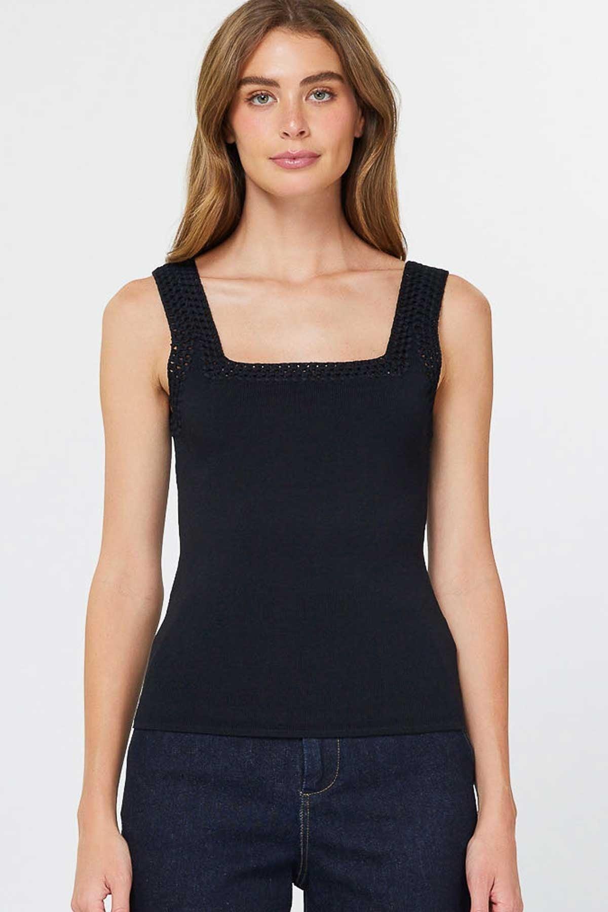 Kiki Top boasts a chic square neckline and goes sleeveless for those sunny days! Adorned with playful crochet trim around the neck and straps, this tank hugs you in soft, stretchy knit fabric that moves when you do. Just give it a gentle cold-water hand wash to keep it looking fabulous!