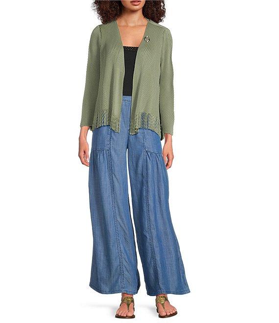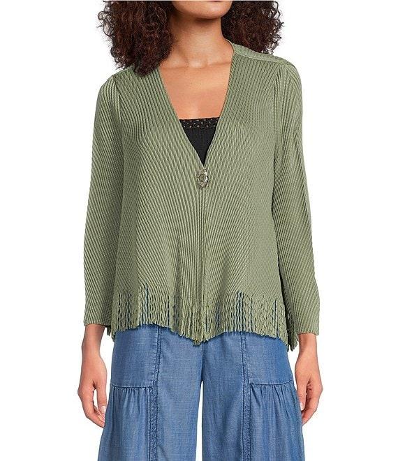 Current Air Pleated V-Neck 3/4 Sleeve Fringed Hem Cardigan