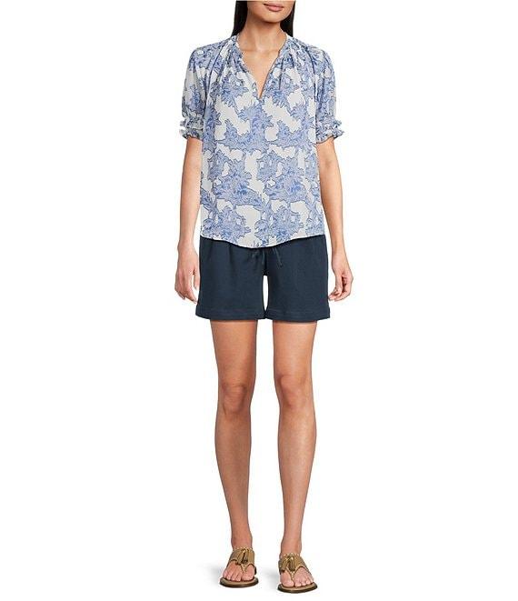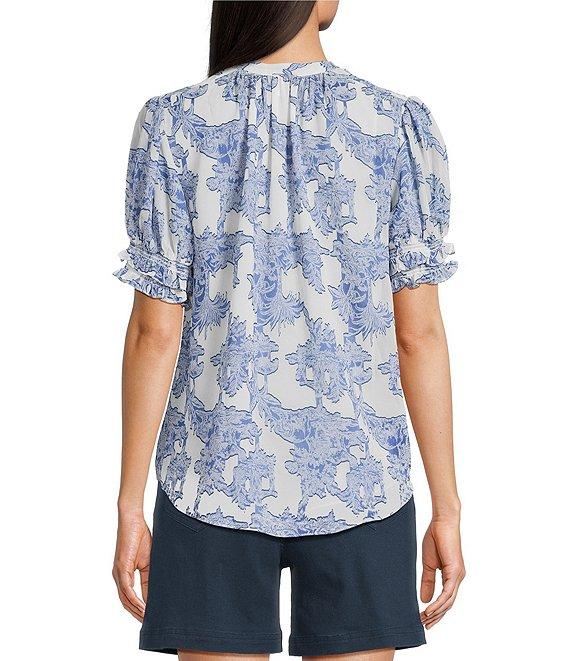 From Current Air, this blouse features: Jacquard fabrication Print pattern Split neck round collar Short sleeves Smocked tiered ruffle sleeve detail Relaxed fit Slightly curved hemline Pullover construction Approx. 24.5" length Machine wash cold, gentle cycle/line dry or dry clean Imported.