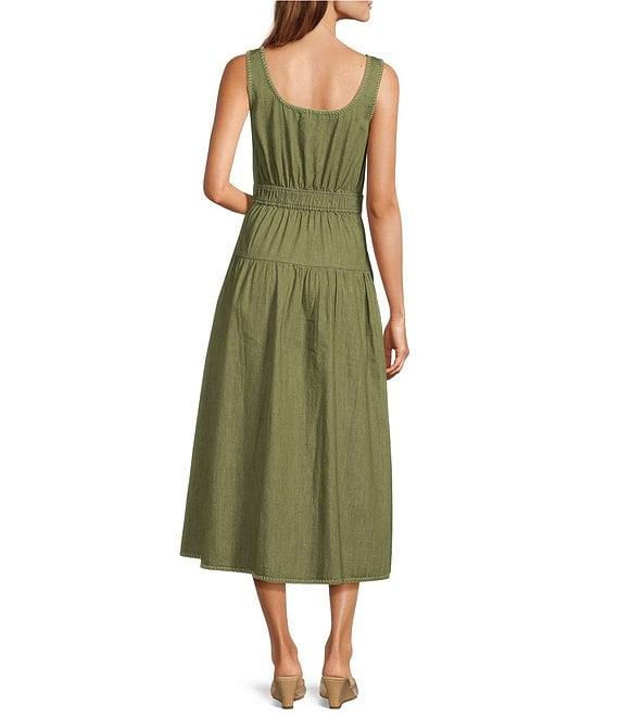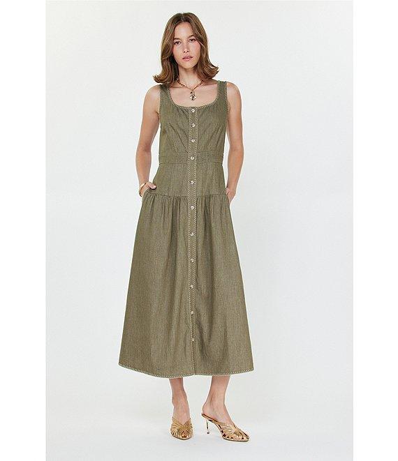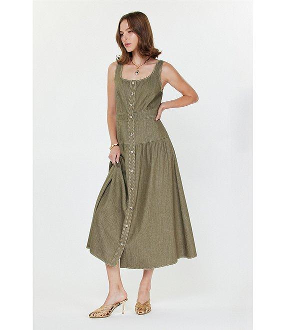 Current Air Square Neck Sleeveless Stitch Detail Button Front Midi Dress
