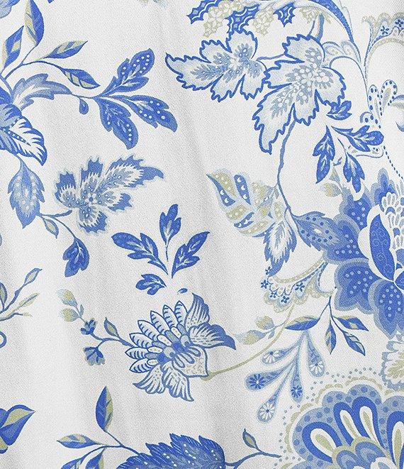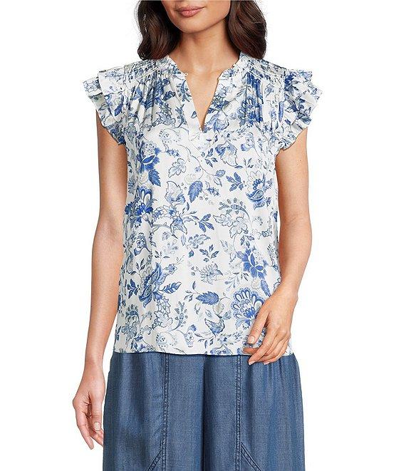 From Current Air, this blouse features: Woven fabrication Floral print Ruffle collared neckline Layered flutter sleeves Smocked yoke Relaxed fit Straight hemline Partial button closure Approx. 25.5" length Recycled/polyester Machine wash/line dry Imported.