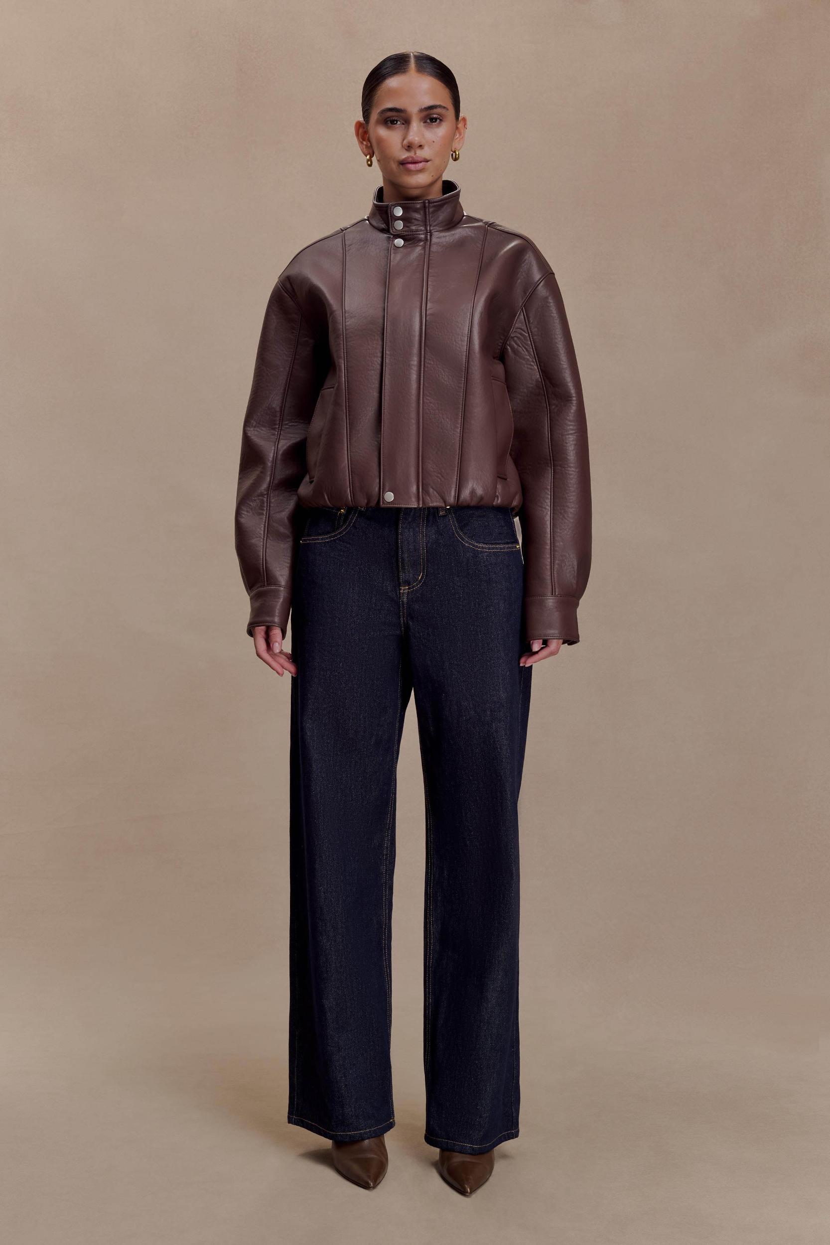 Contemporary attitude. The CURTIS Faux Leather Bomber Jacket reimagines a wardrobe staple with a sleek, refined edge. Designed with a mandarin collar and front and back panel lines, it creates a clean, structured silhouette. The boxy fit adds a modern proportion, while a concealed front zipper placket and three snap buttons at the collar and hem ensure a polished finish. Fully lined for comfort and longevity, this jacket pairs effortlessly with both denim and tailoring for a timeless off-duty look.