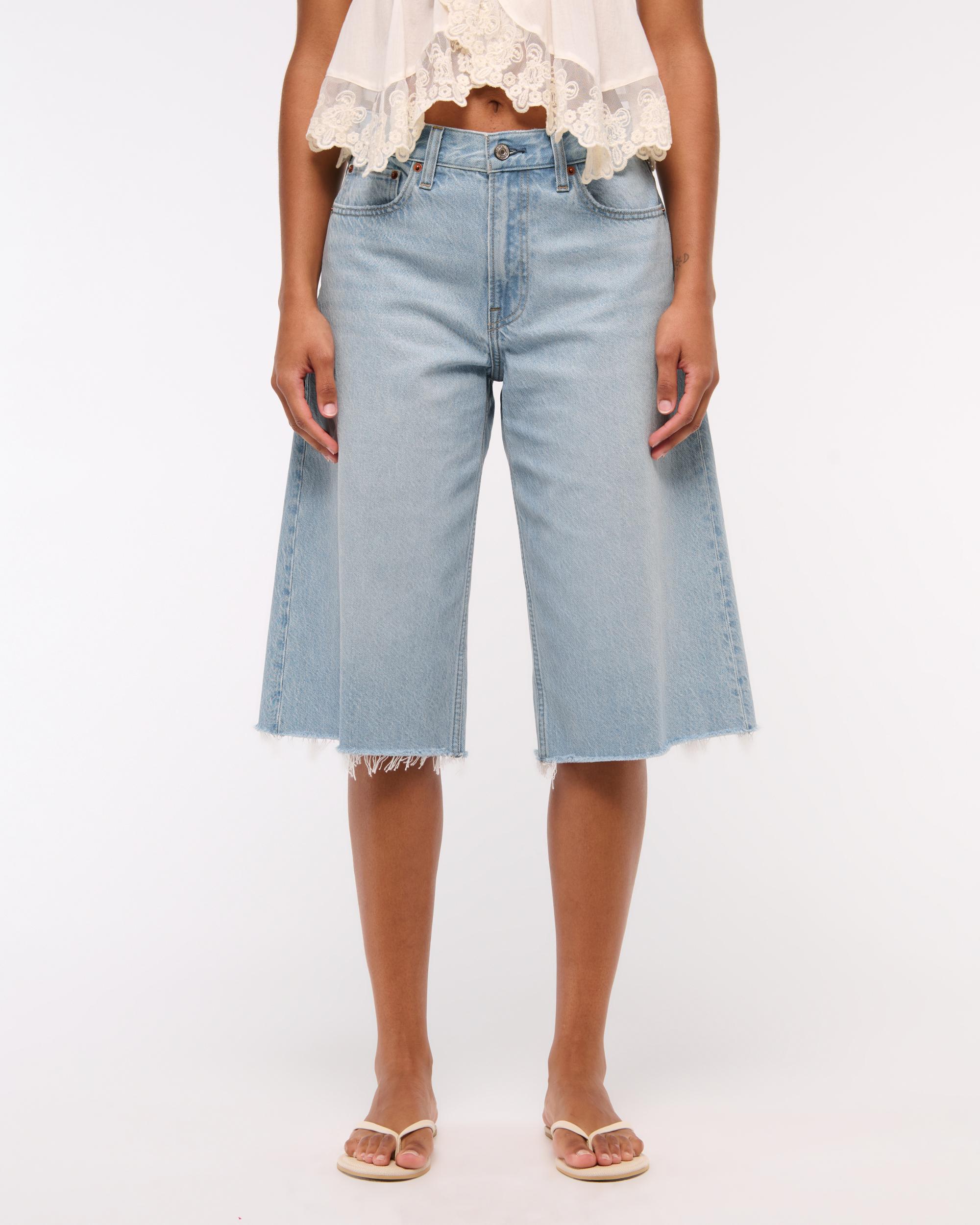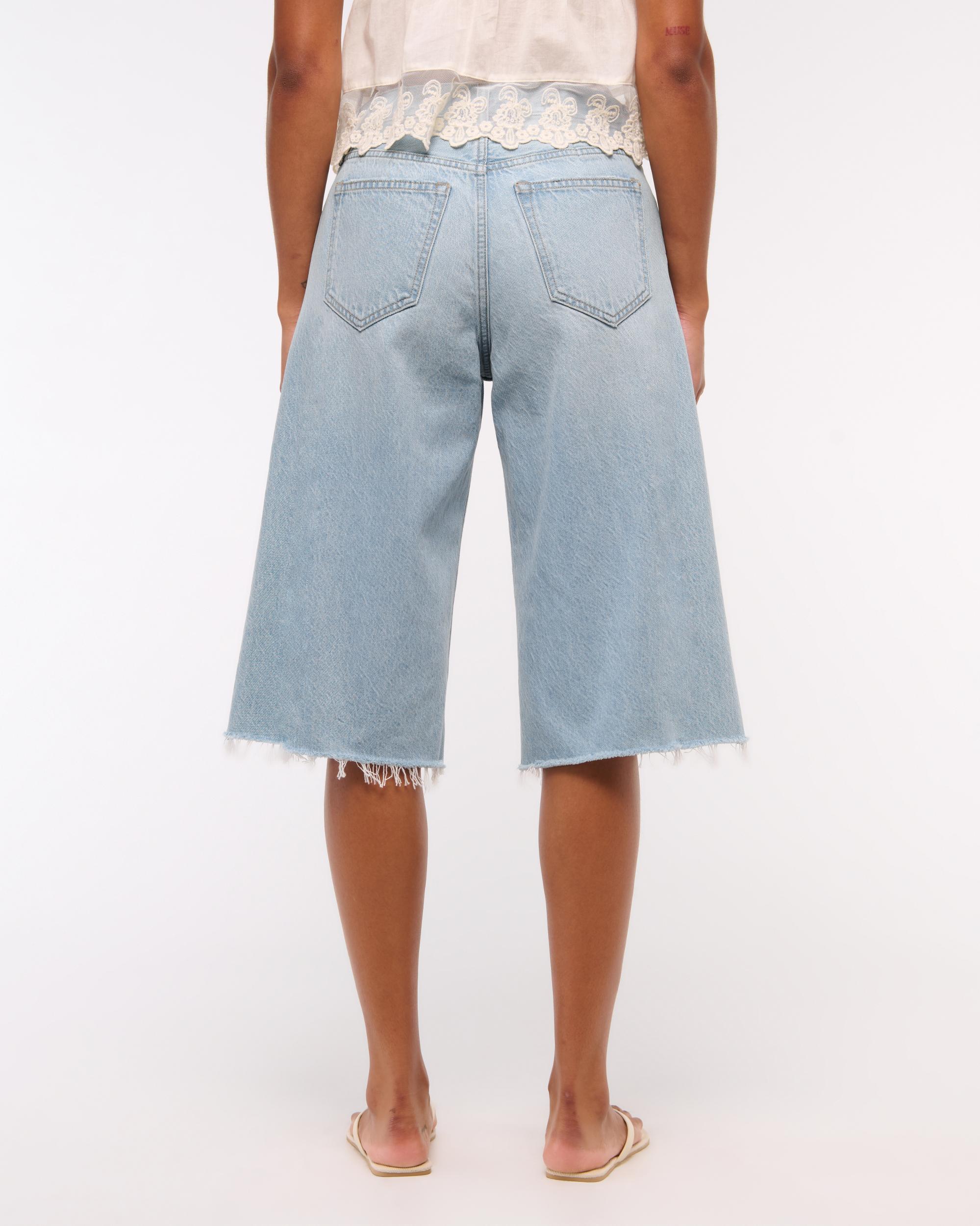 Our new Curve Love long jorts in a medium wash with a distressed hem. This fit features a 9.5” mid rise, is relaxed at the waist and hips with a loose leg shape and a super cropped inseam. The viral fit that eliminates waist gap: Curve Love features additional room through the hip and thigh for curve-hugging comfort. Made from our lightweight rigid denim, a super soft authentic cotton fabric with no stretch.