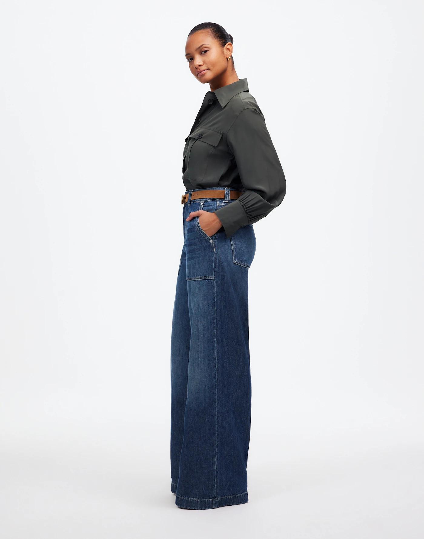 The cut: designed for those with an hourglass shape, these superwide-leg curvy jeans have a high waist with a contoured band, a longer rise (for a rounder booty) and a little extra room at the hips and thighs. Featuring utility-inspired front pockets.