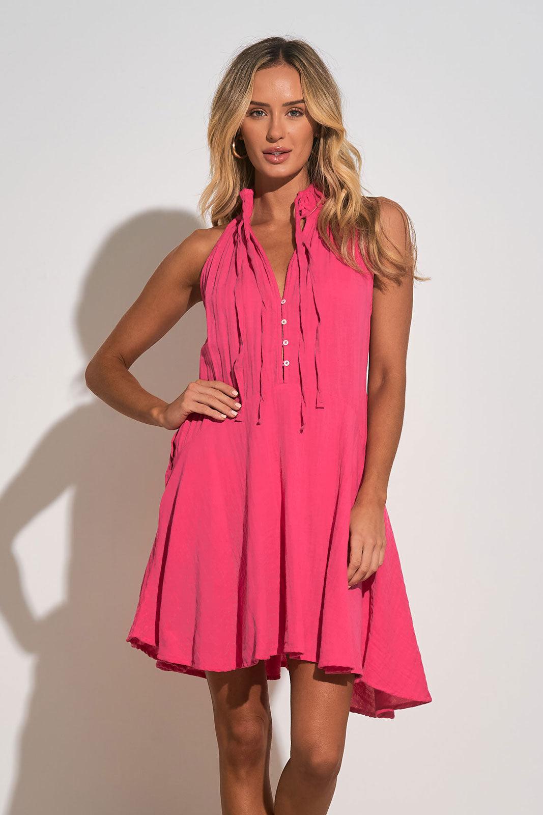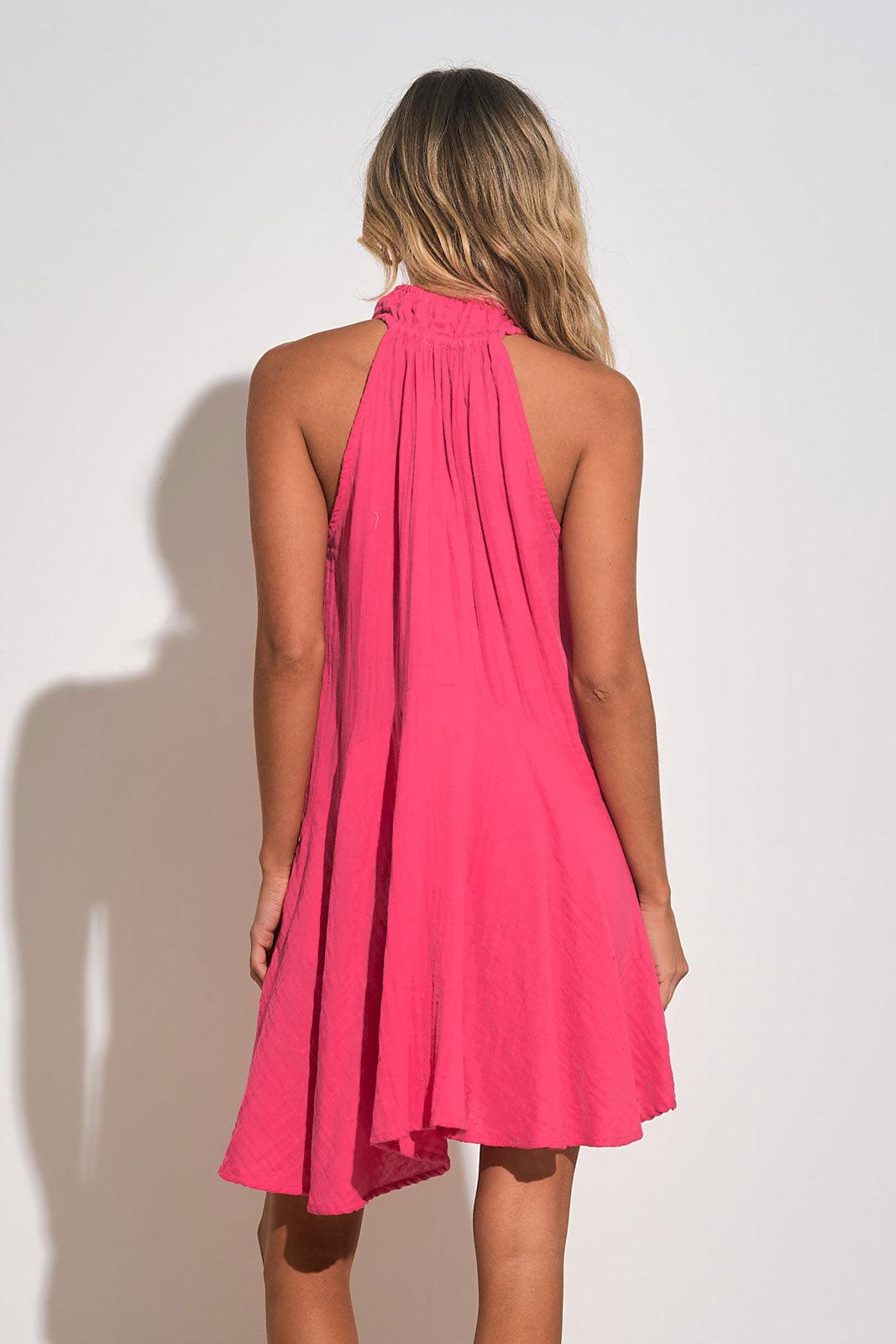 The Cut In Halter Dress features a high v-neckline with a tie closure and side pockets. This over-the-head-throw-on will be your favorite go to on a hot summer day.